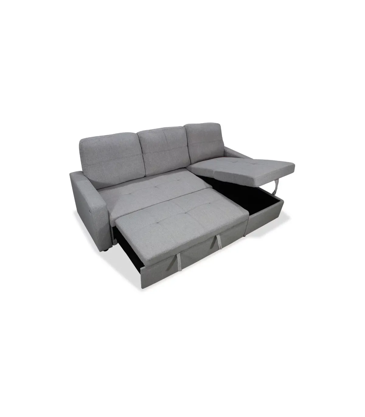 Modelo reversível do sofá da cama do sofá reinds do modelo em cinza claro. Este sofá é a solução perfeita para espaços reduzidos. Com um design reversível, um arrasto removível e sistema de amplocagem para armazenamento. Sua simples abertura torna uma cama prática em segundos, ideal para pequenos apartamentos.