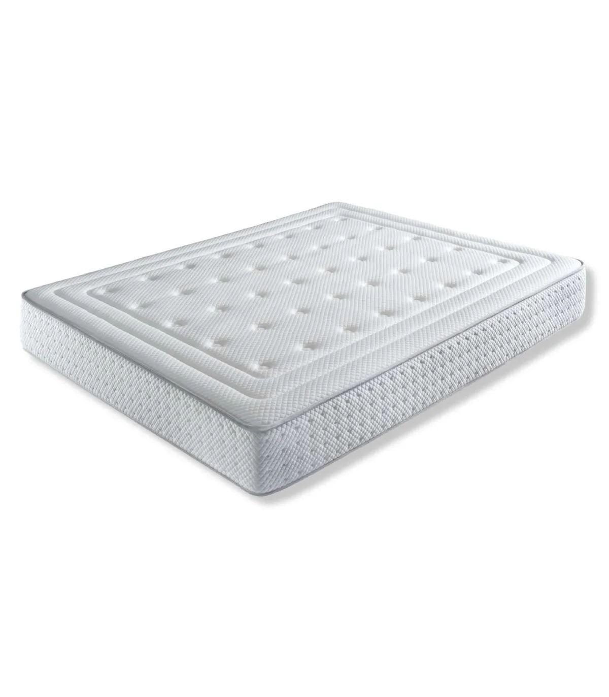 Colchão com núcleo HR D/21 kg/m3. Sistema de ferro contínuo em tecido de estria, toque suave com ferro viscoelástico mais termo 120 gr. e recepção progressiva confortável para desfrutar do resto mais agradável, permitindo a tirar o fôlego favorecendo a circulação de ar em ambos os lados. Cara inferior com grade AIR 3D que fornece máxima respiração favorecendo a circulação de ar.