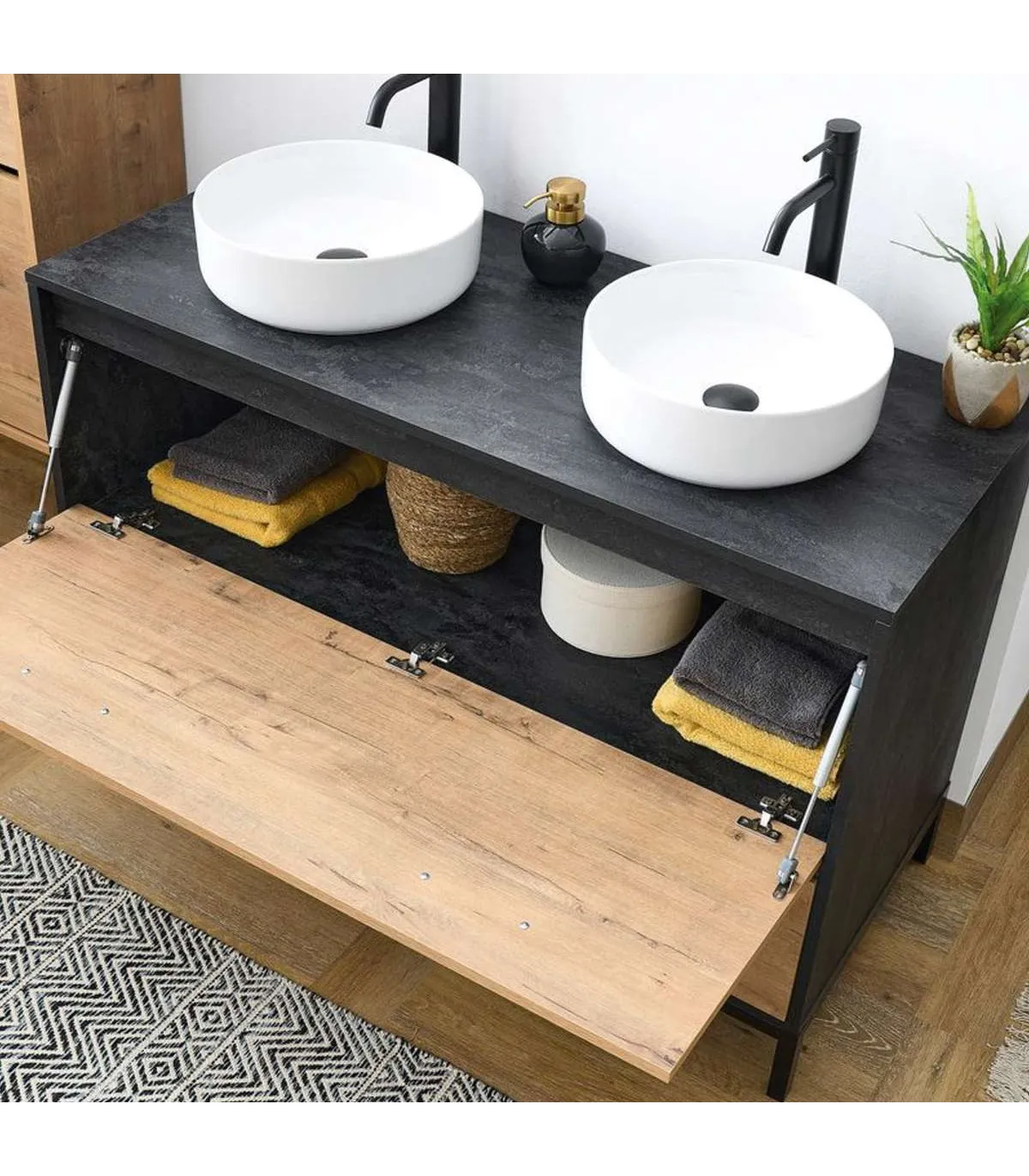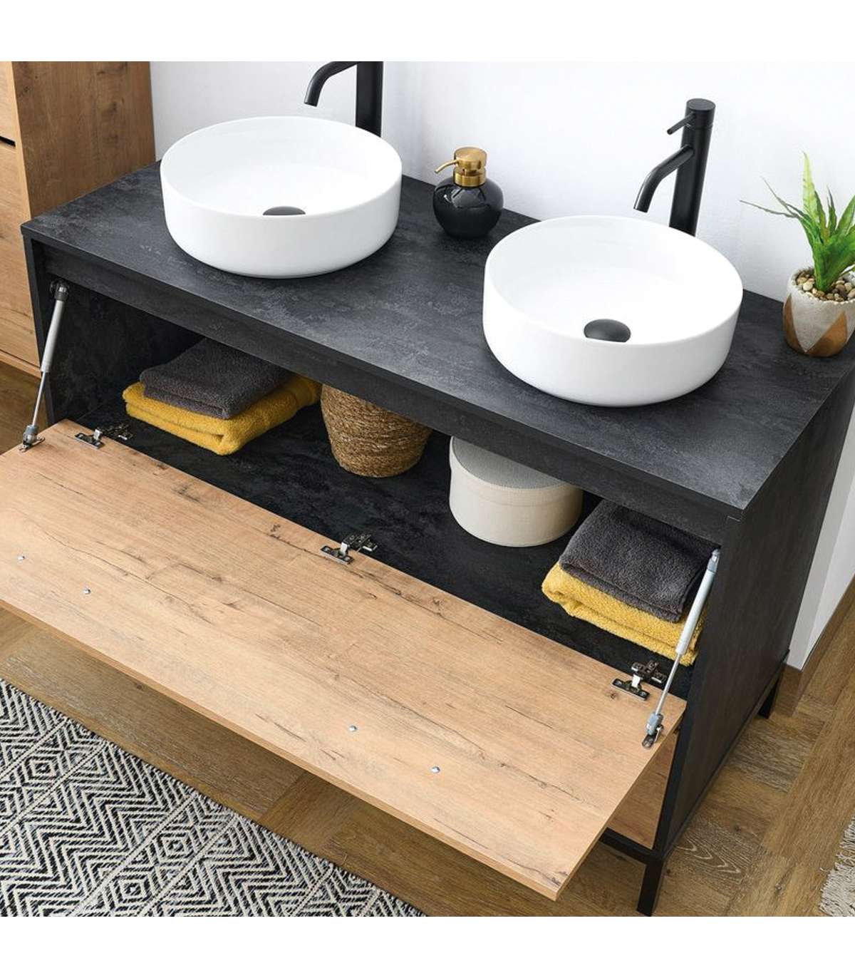 Móveis de casa de banho com dois pias modelo Sena acabamento imitação de mármore/roble ouro, é um exemplo de simplicidade segue uma linha limpa que o torna um básico perfeito para qualquer banheiro.