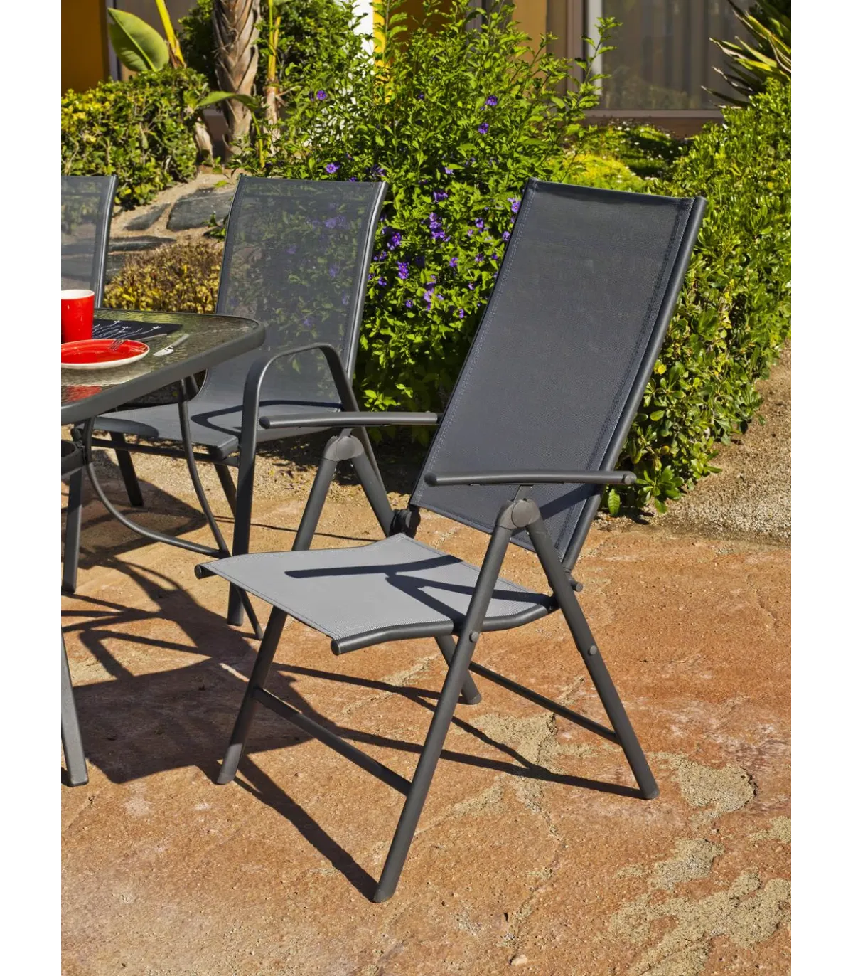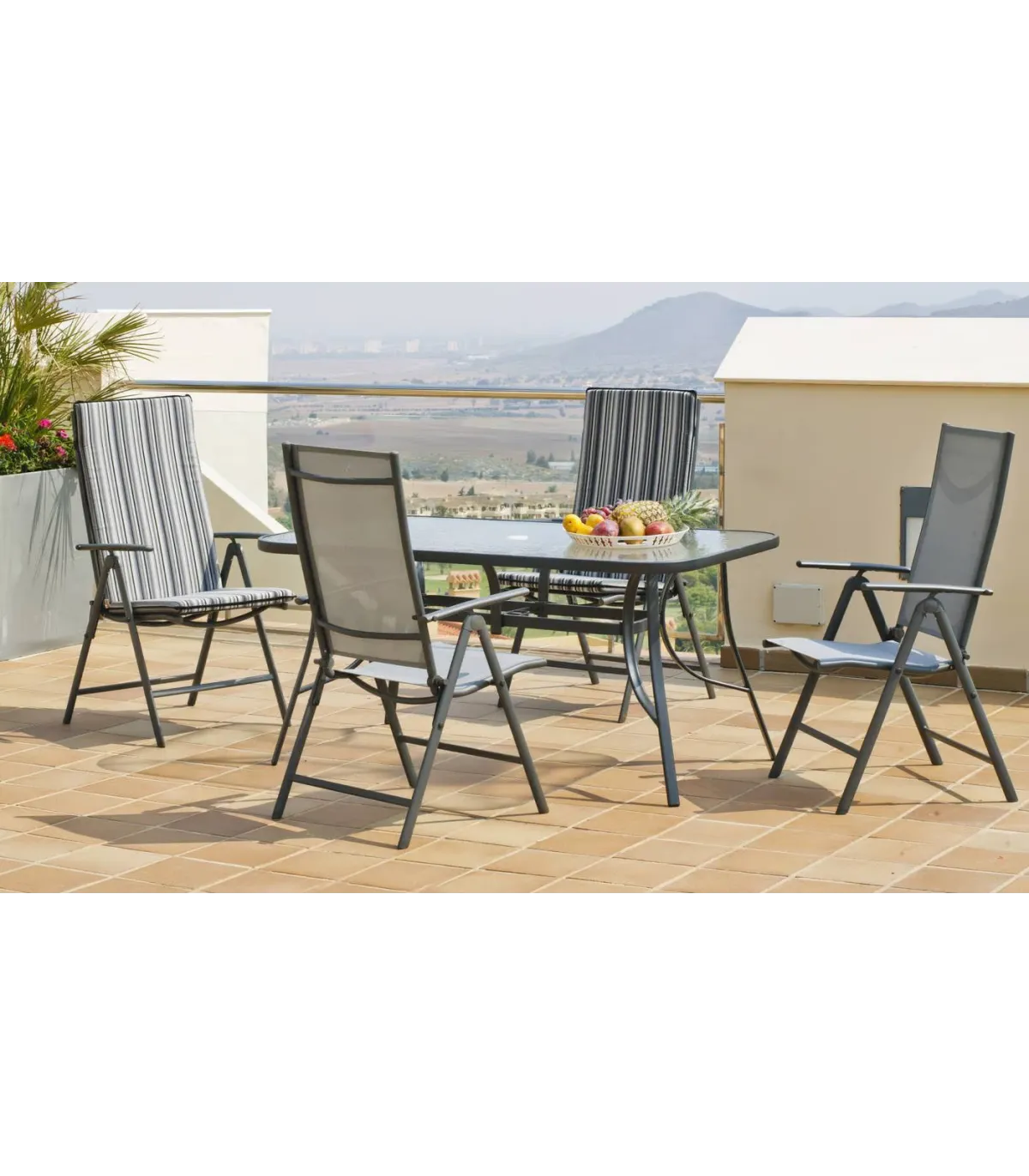 Mesa em aço Sulam-151/4TB + conjunto de 4 espreguiçadeiras em acabamento cinza antracite.