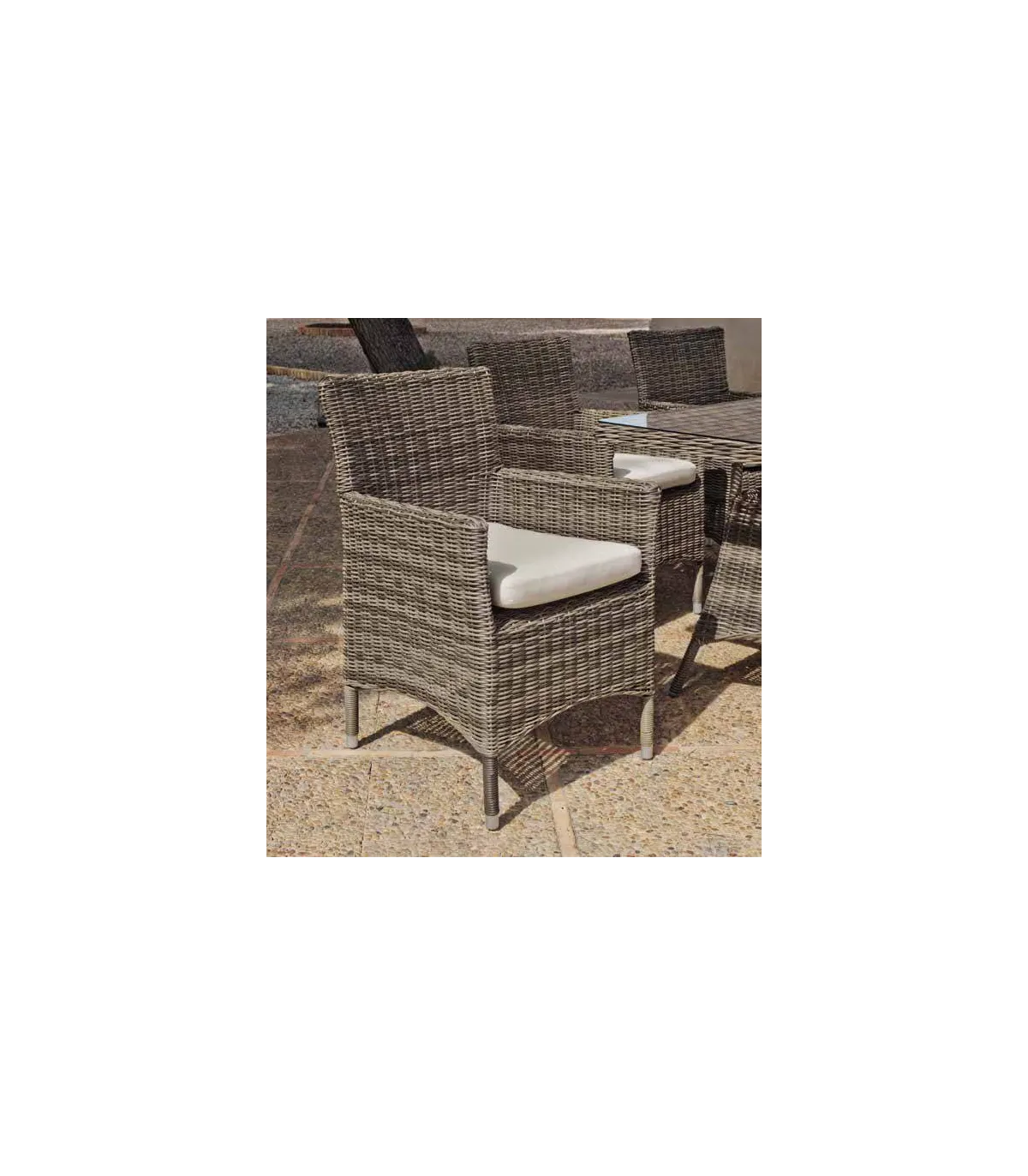 Conjunto de rattan sintético marrom para jardim e terraço, elegante e funcional. Composto por uma mesa de 160 cm e 4 cadeiras com almofadas brancas.
