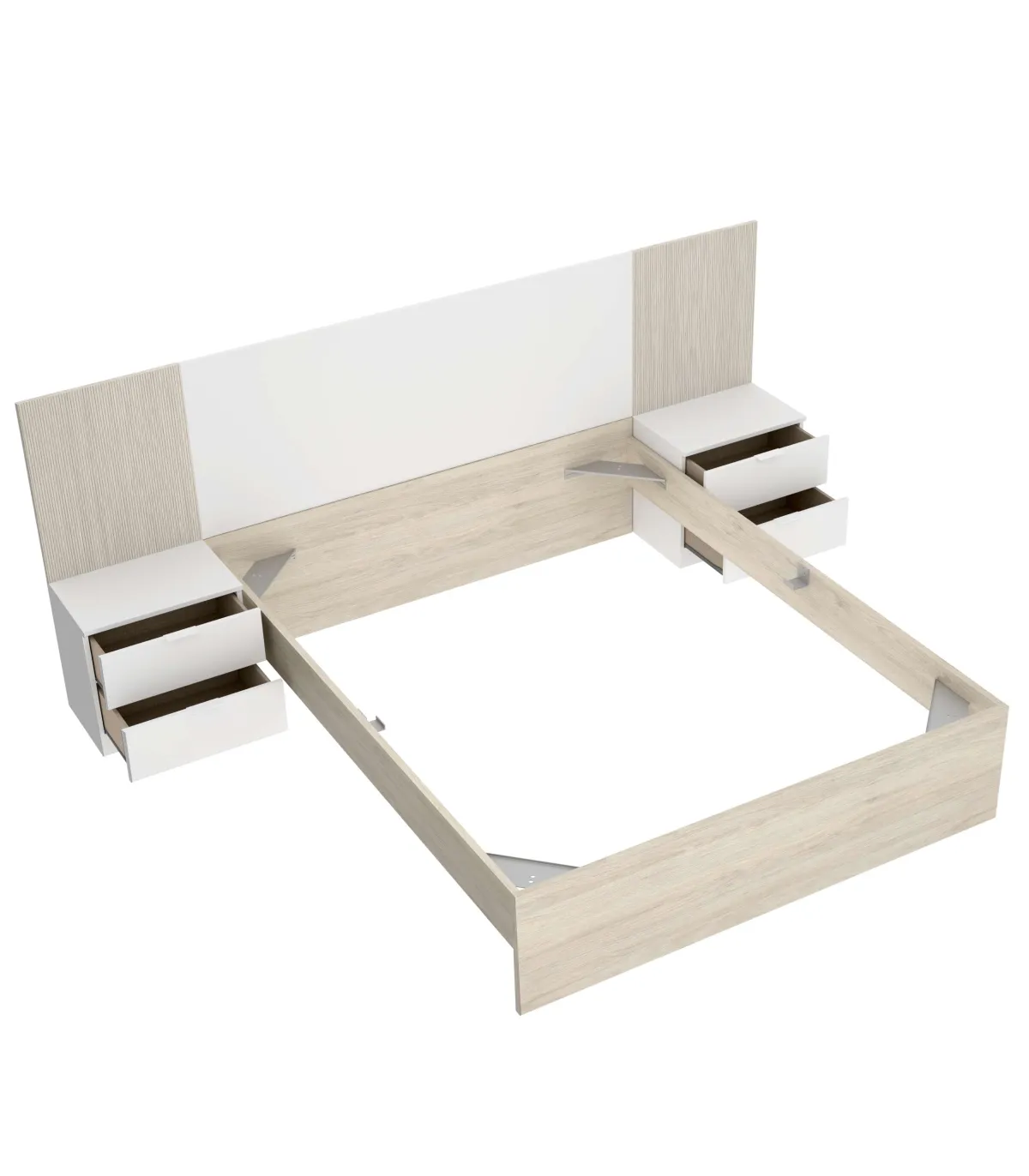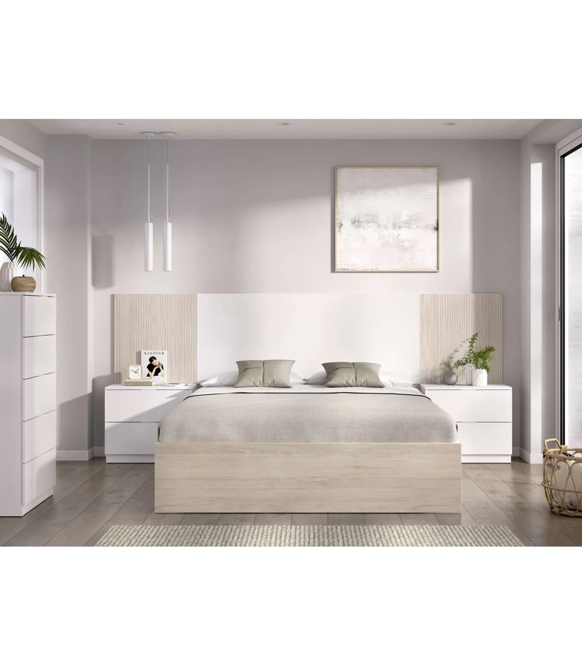 Jogo de cama, cômoda e duas mesas Lula em acabamento laminado branco/natural.