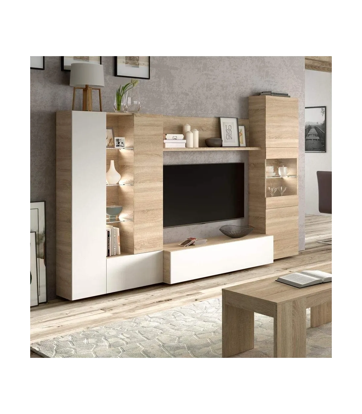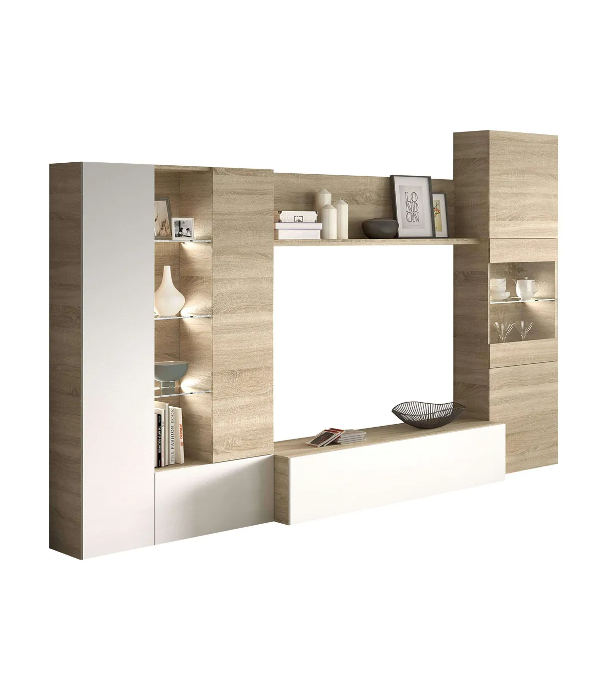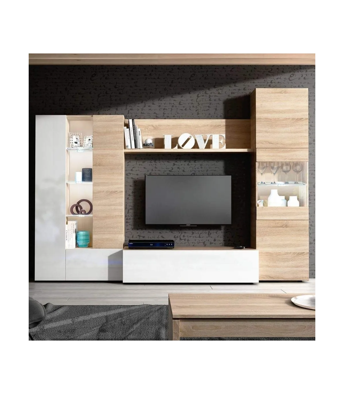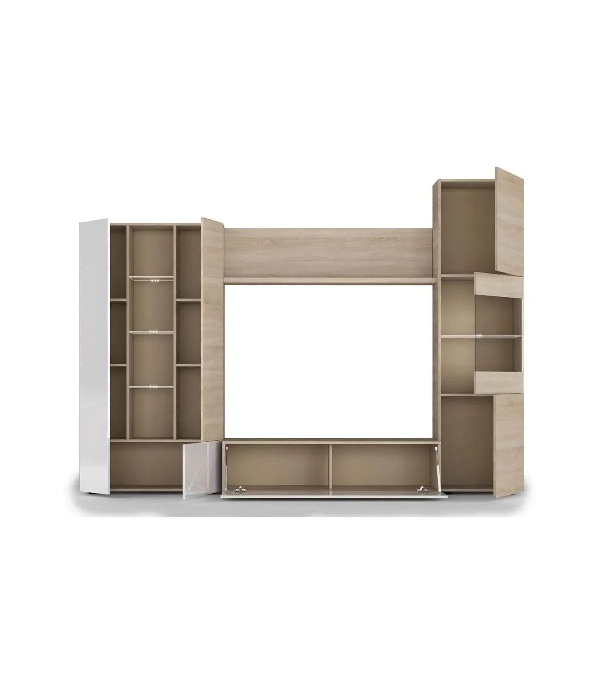 Bela composição da sala de estar com grande espaço de armazenamento. É feito de carvalho canadense em combinação com o branco brilhante e incorpora quatro pedaços de vidro com iluminação LED.