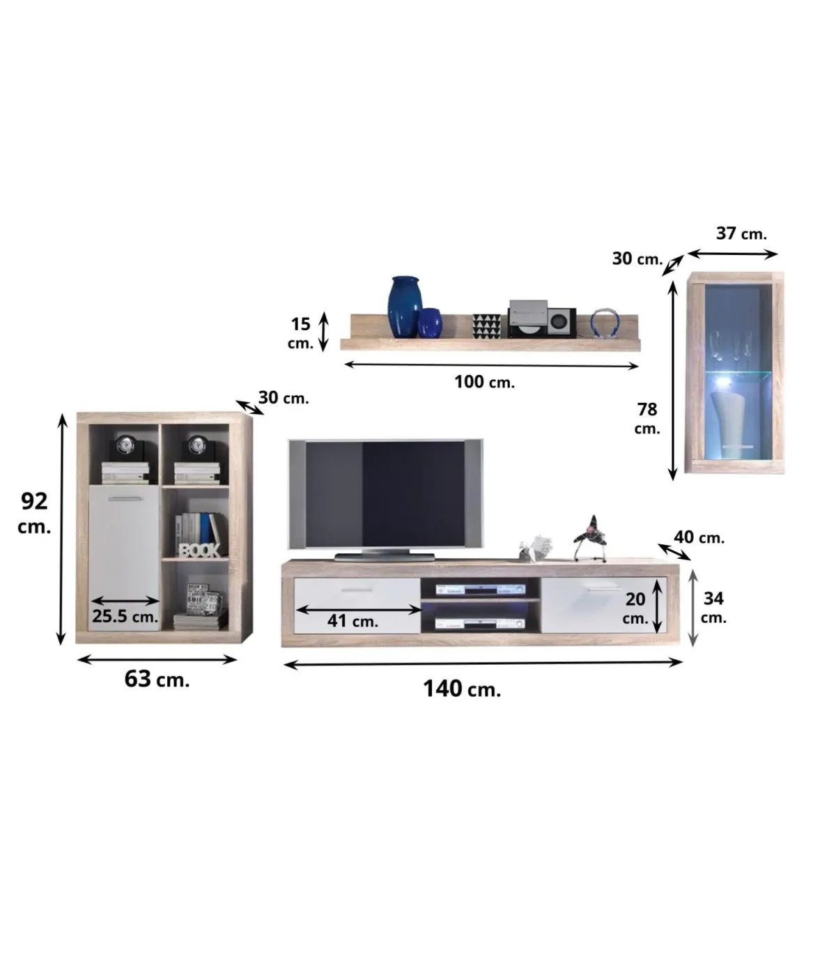 - Módulo esquerdo 63 cm de largura x 30 cm de profundidade x 92 cm de altura, com prateleiras internas e uma porta branca (25,5 cm de largura) com prateleira interna.