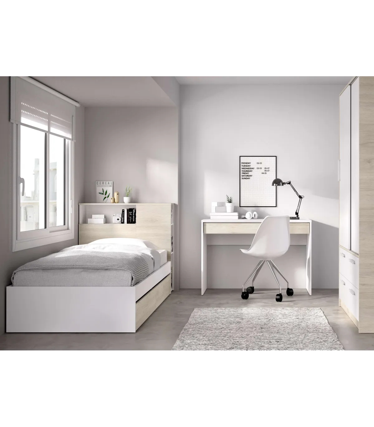 Cama jovem de 90cm com 2 gavetas, roupeiro e mesa Tamesis natural / branco finish.