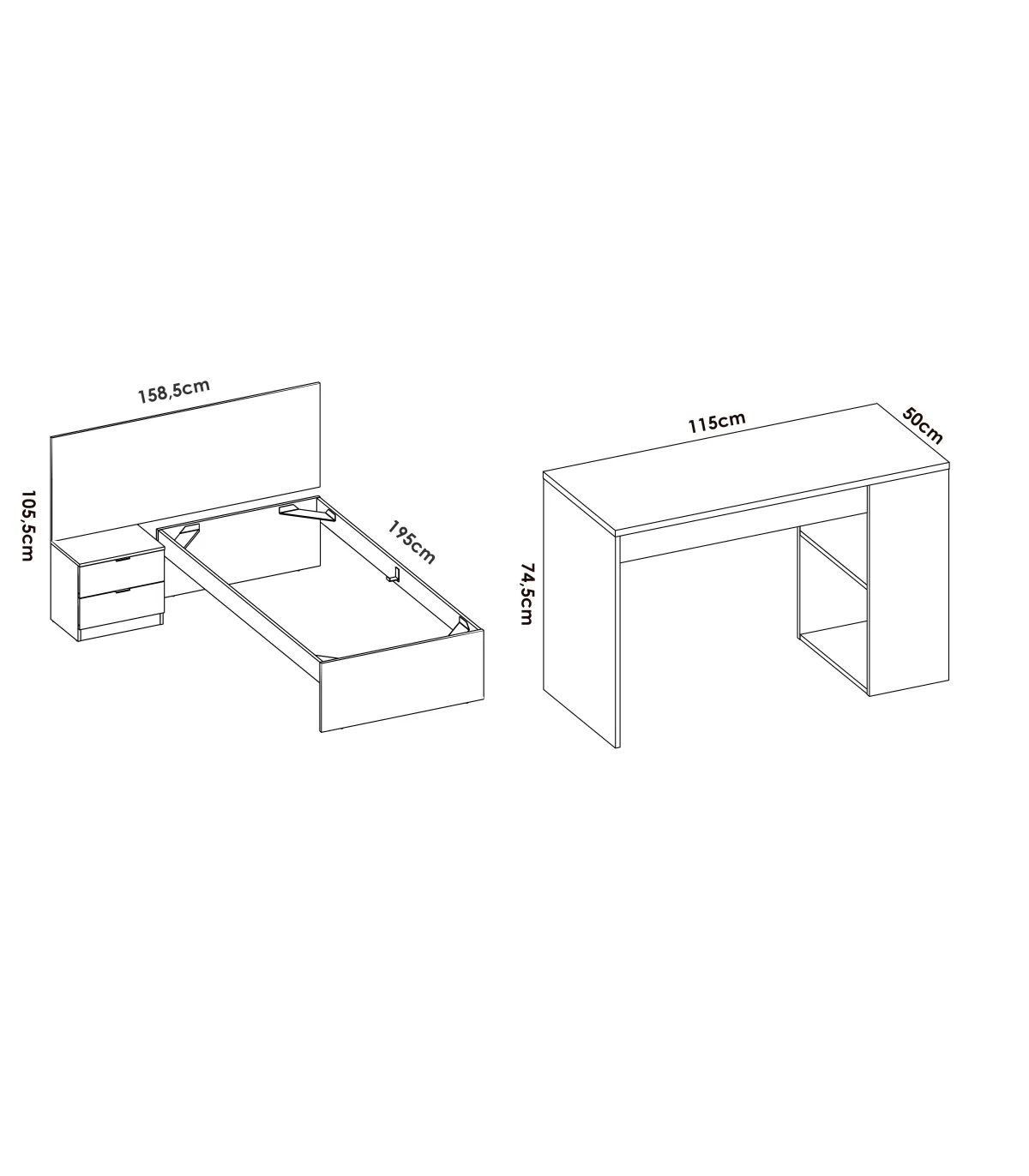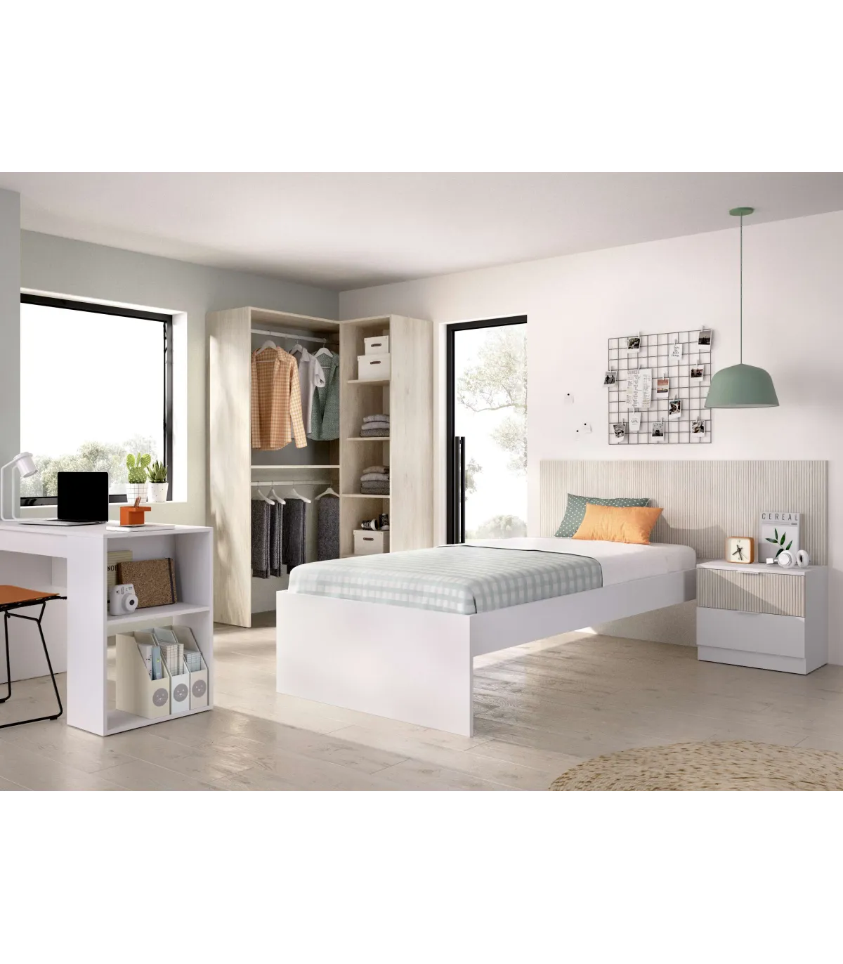 Conjunto jovem , formado por 90 cm colchão cama , mesa com prateleiras, roupeiro canto e 2 gaveta mesa. Esta cama de solteiro juventude é a peça perfeita