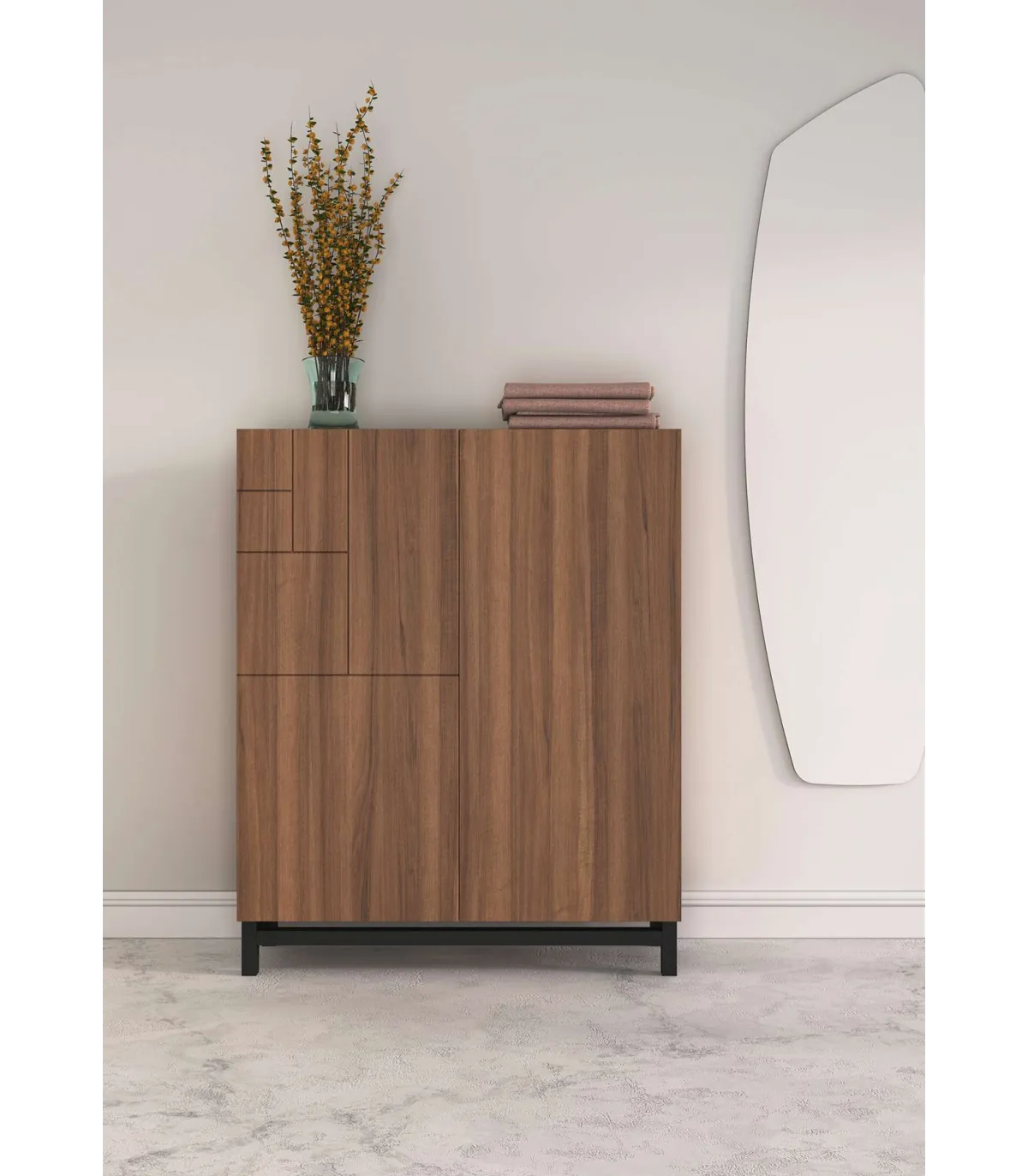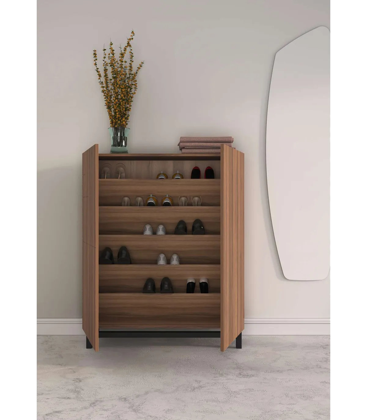 O sapateiro é um mobiliário, feito de melamina de alta qualidade em cor de noz, projetado para fornecer organização e estilo para sua casa. Suas pernas de madeira de faia lacada preta dão-lhe um toque moderno e elegante. Tem 2 portas e 5 prateleiras onde você pode ter seus sapatos organizados.