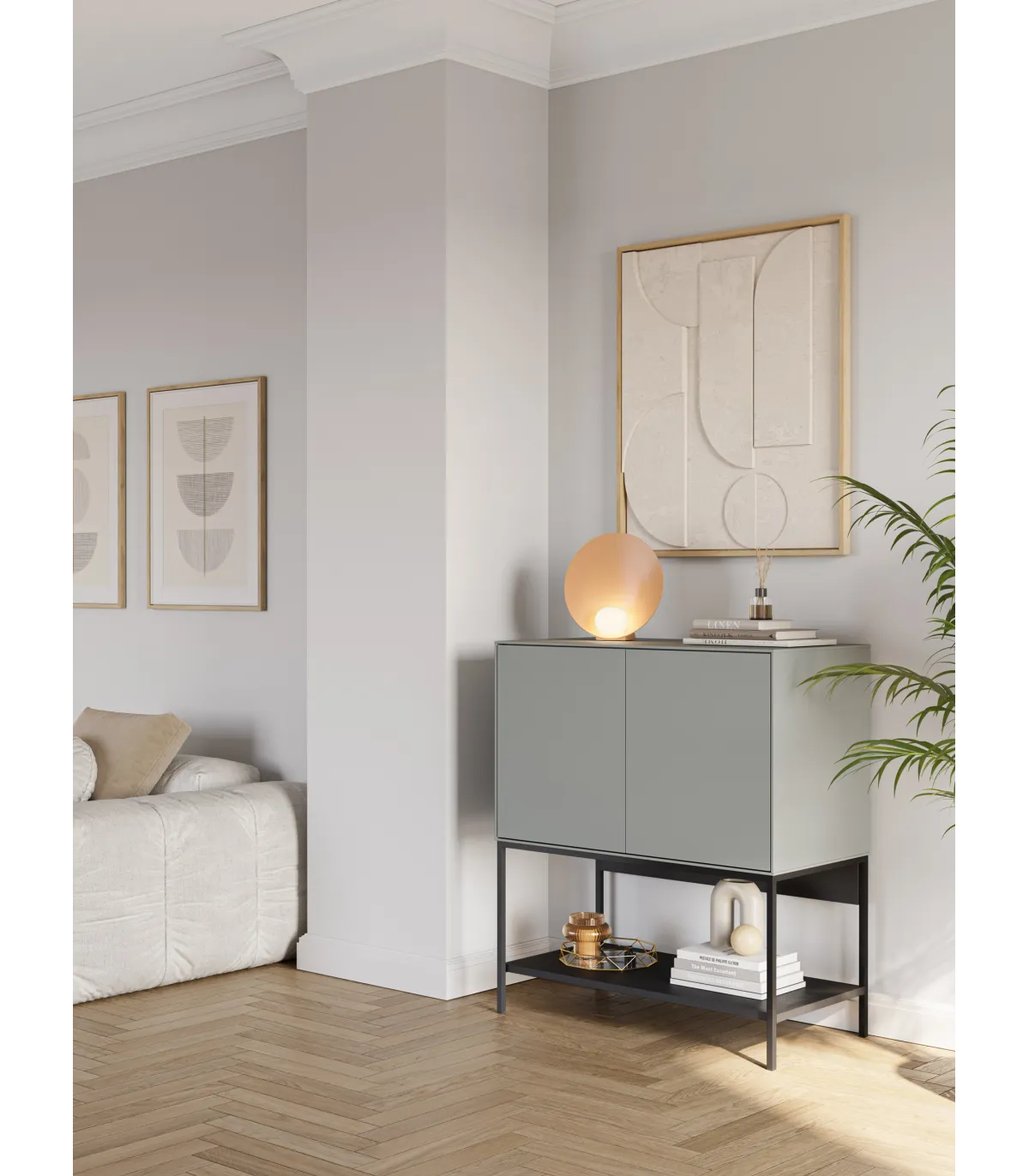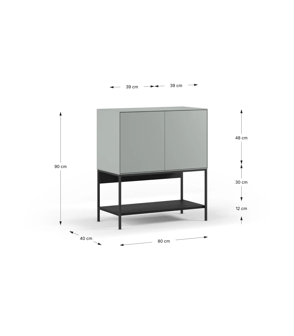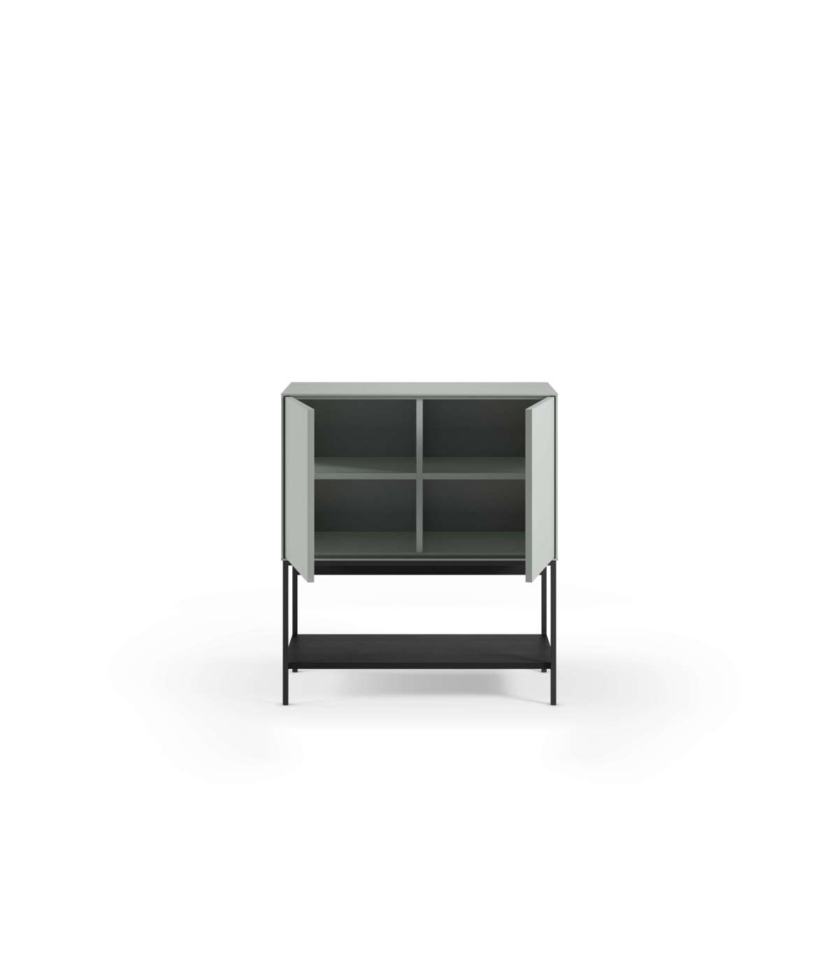 Suas 2 portas fornecem um espaço de armazenamento fechado, ideal para salvar pratos, livros, têxteis ou pequenos objetos. As pernas metálicas dão-lhe solidez e um toque contemporâneo atraente.