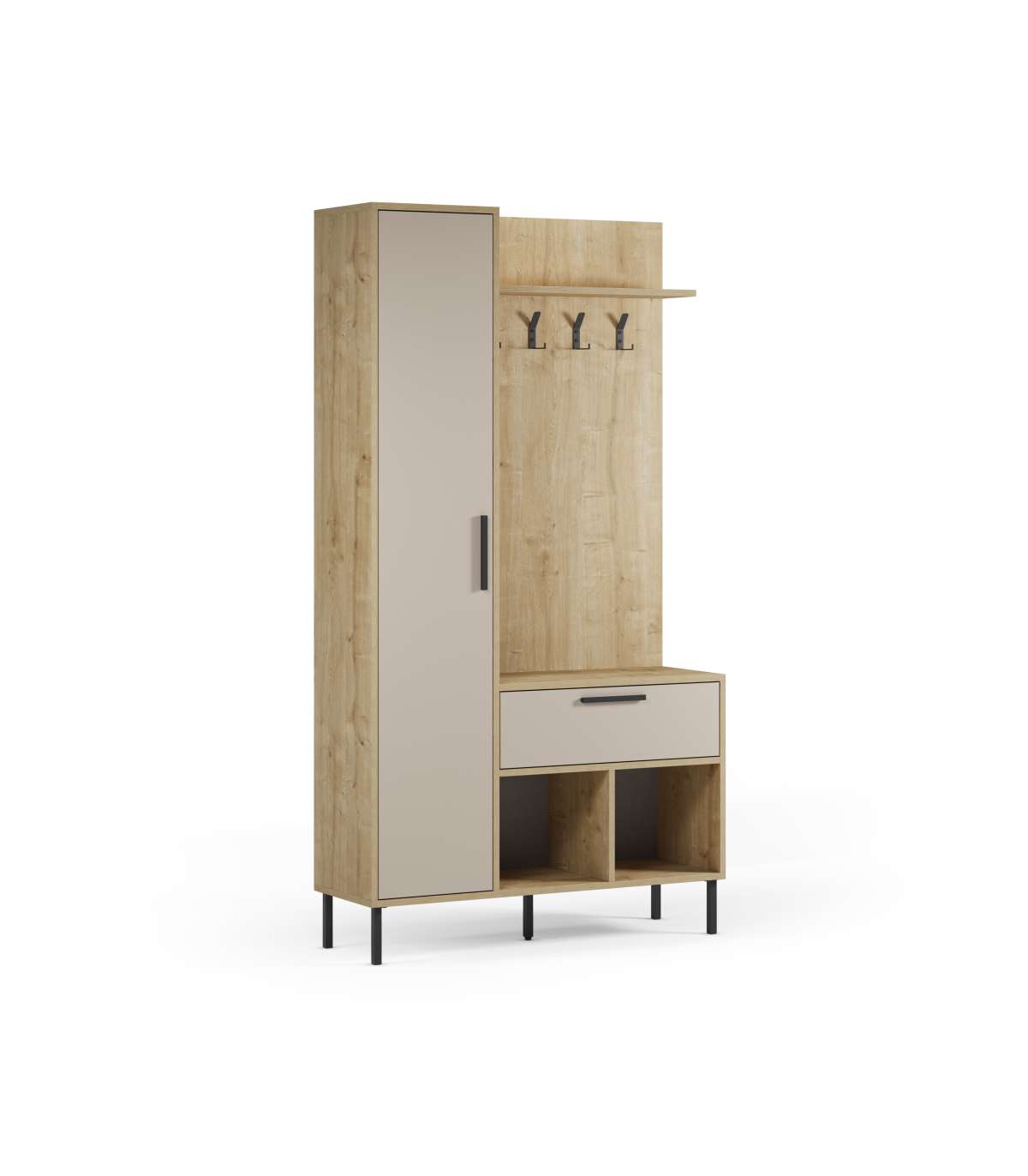 Conjunto de receptor de estilo moderno que combina funcionalidade e design em uma única peça de mobiliário. Inclui sapateiro, mais leve e espelho, tudo integrado em uma estrutura compacta, ideal para entradas contemporâneas.