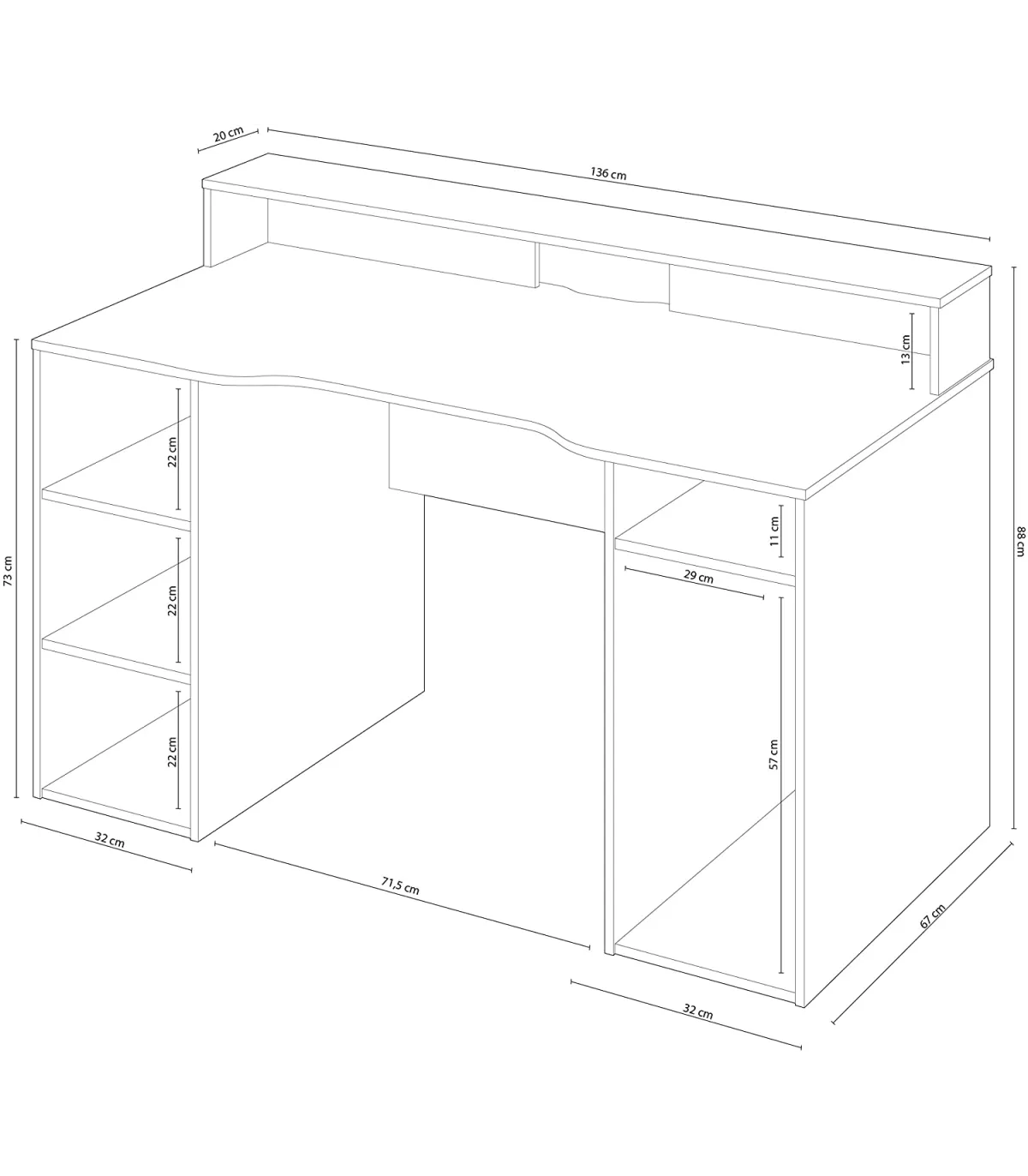 88 cm (alto) x 136 cm (largura) x 67 cm (prof.)