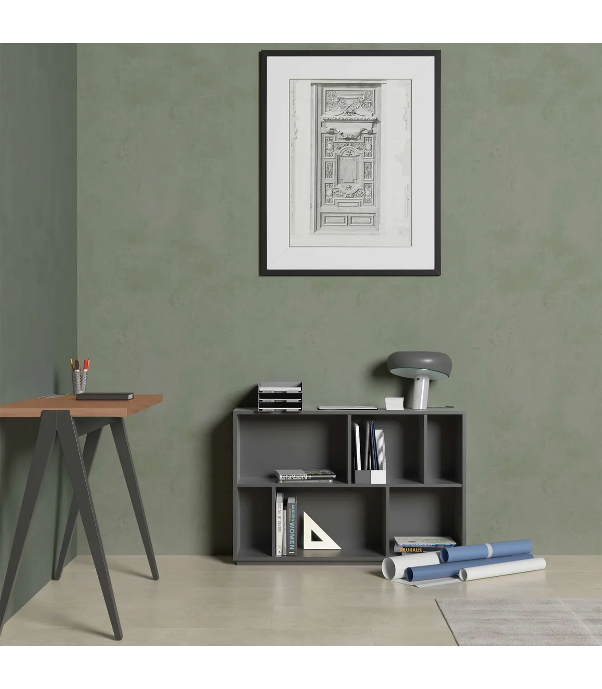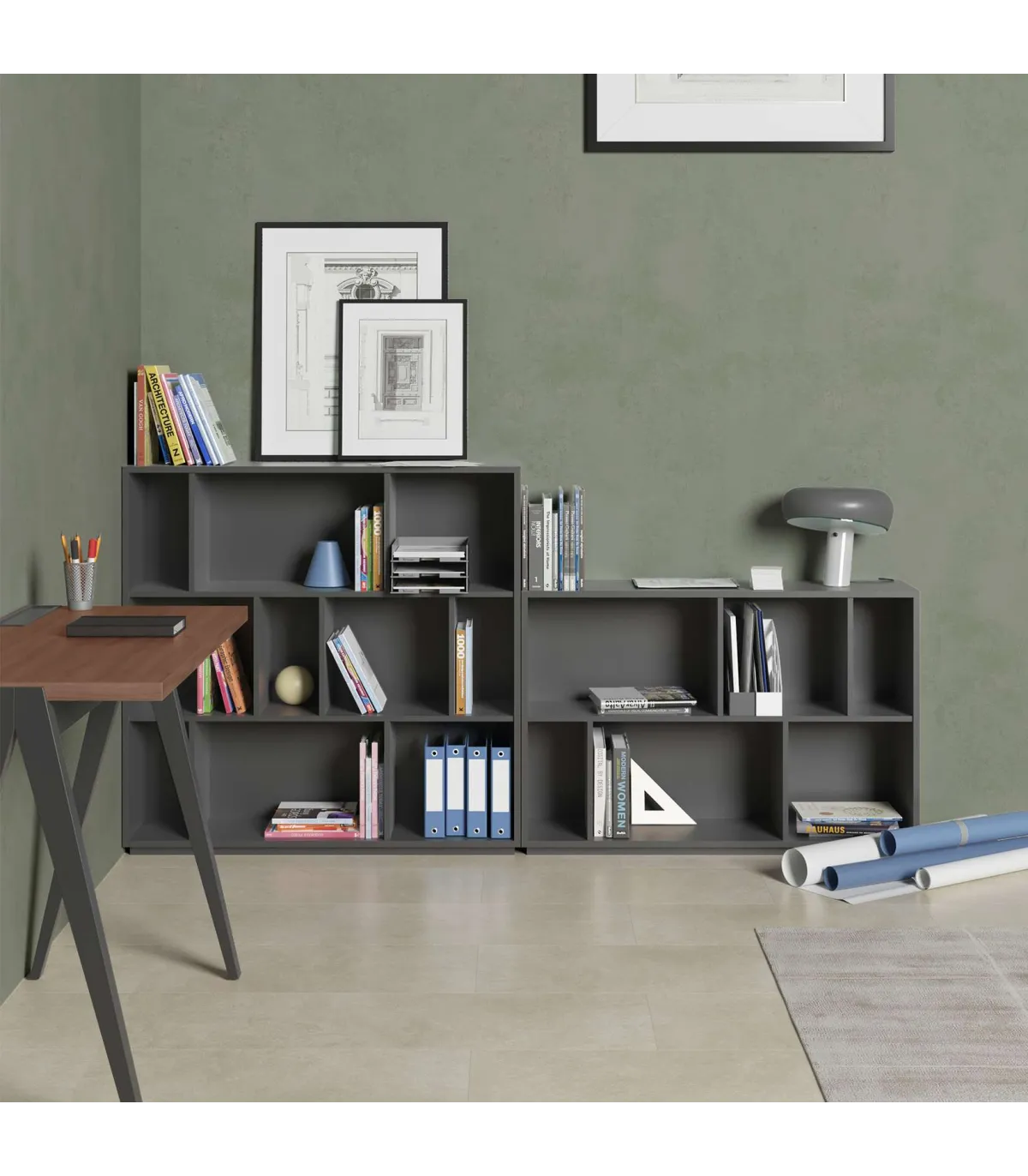 A caixa feita de melamina de qualidade com acabamento de grafite, é um mobiliário versátil e funcional que oferece 6 compartimentos de diferentes tamanhos, distribuídos em 2 alturas. Esta prateleira é ideal para organizar e exibir livros, decorações ou outros objetos em sua casa ou escritório. A melamina de alta qualidade garante sua durabilidade e força, enquanto projeta vários compartimentos fornece opções de armazenamento personalizadas. Com esta prateleira, você pode manter seus pertences classificados e acessíveis de uma forma elegante.