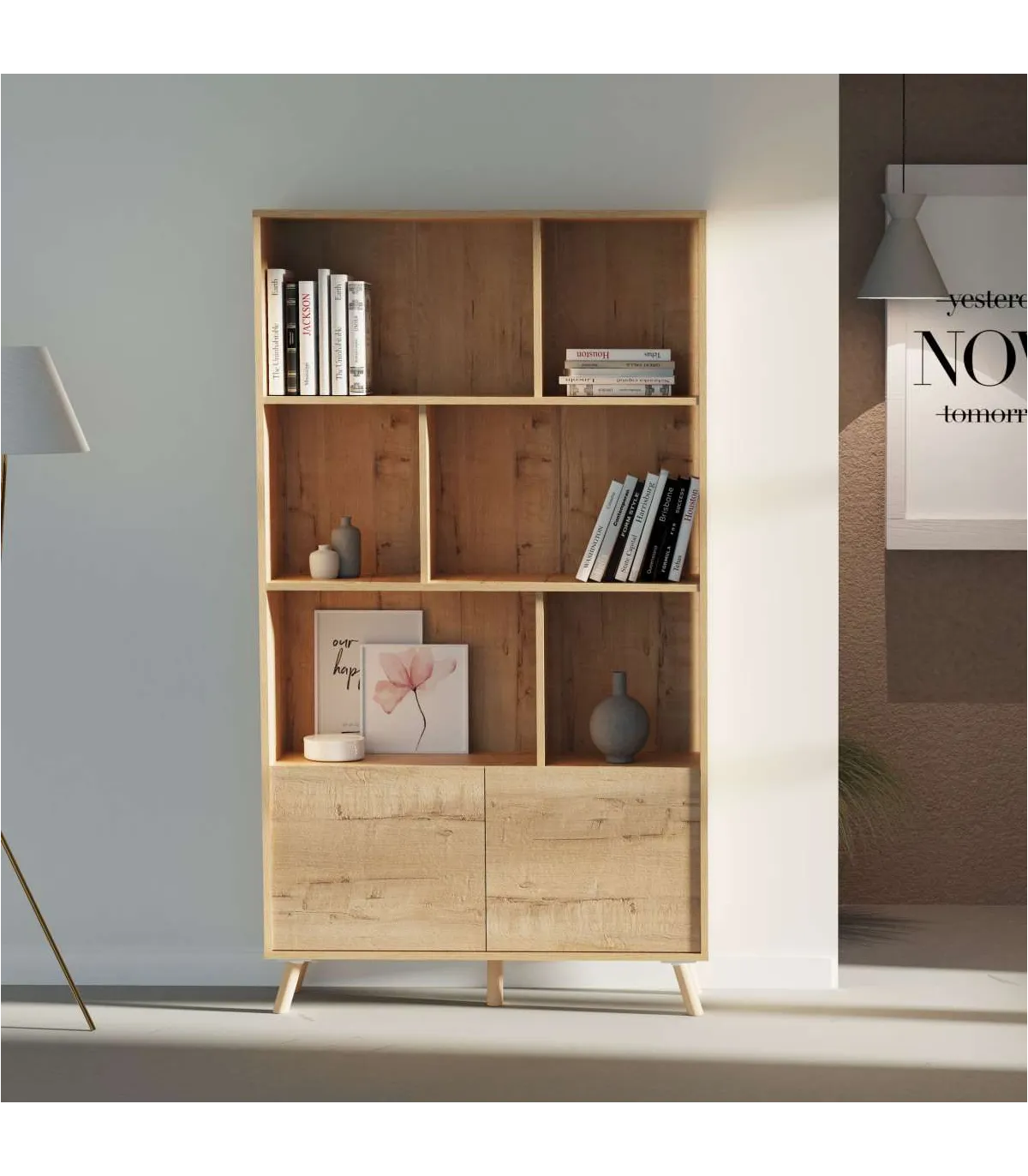 Estante Oslo com acabamento em carvalho dourado, 180cm (altura) 100cm (largura) 30cm (profundidade)
