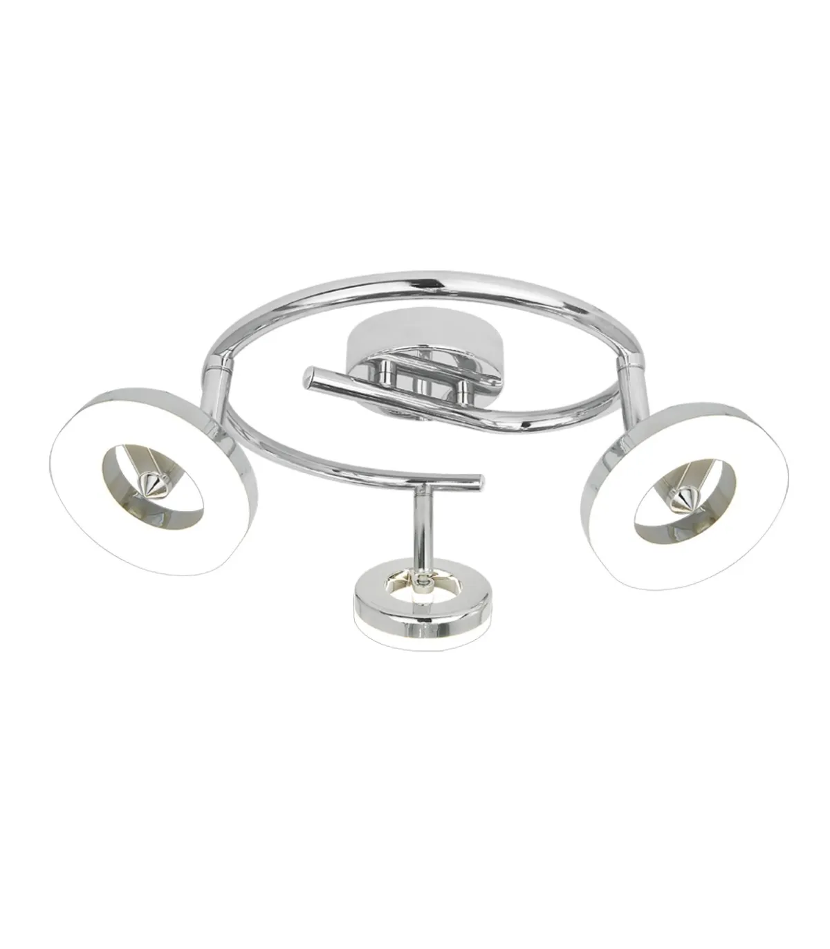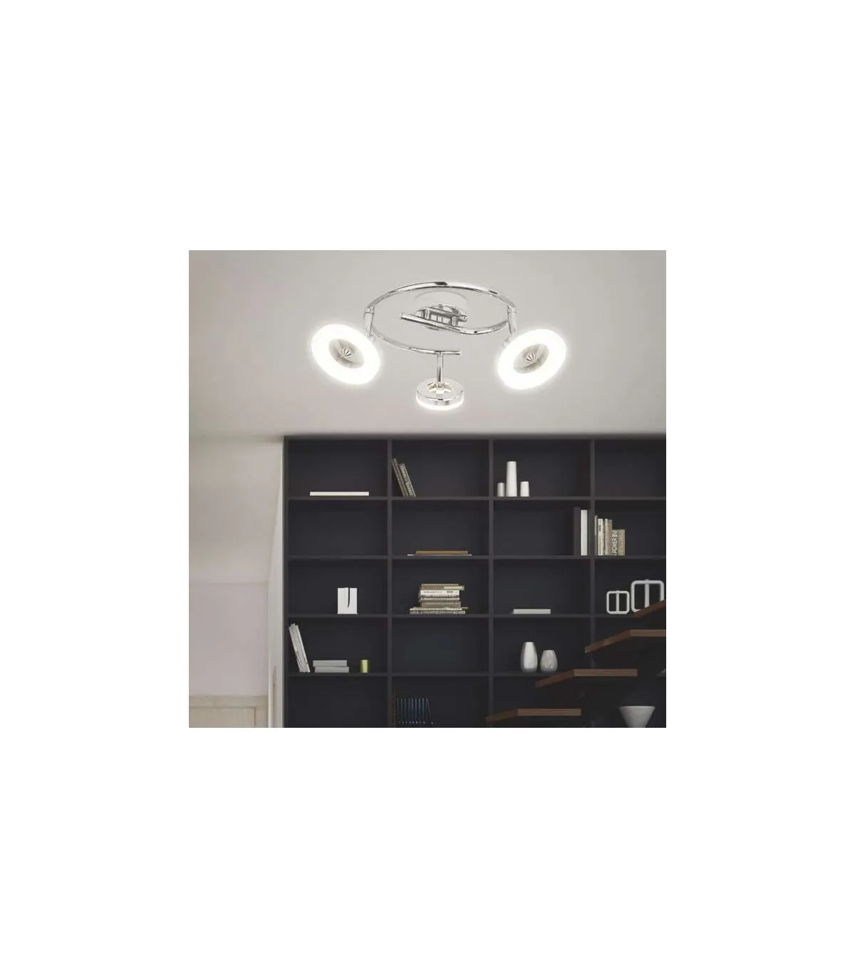 Lâmpada Cedro de três luzes. Cada luz led tem uma tira para guiar a luz, focando a iluminação na direção que você preferir. É feito de metal em acabamento cromado e acrílico no difusor em forma circular. Perfeito para colocar em grandes salas de estar, salas de jantar, corredores e áreas de passagem.