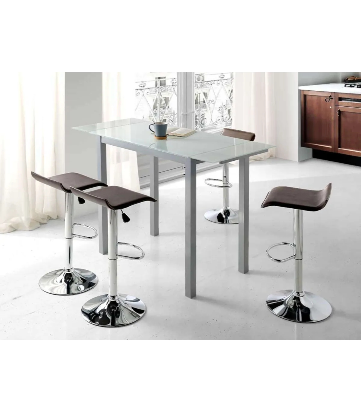 Mesa de cozinha fantástica em formato extensível com estrutura de metal e acabamento de níquel matt com bancada e asas em vidro temperado. Disponível em branco.