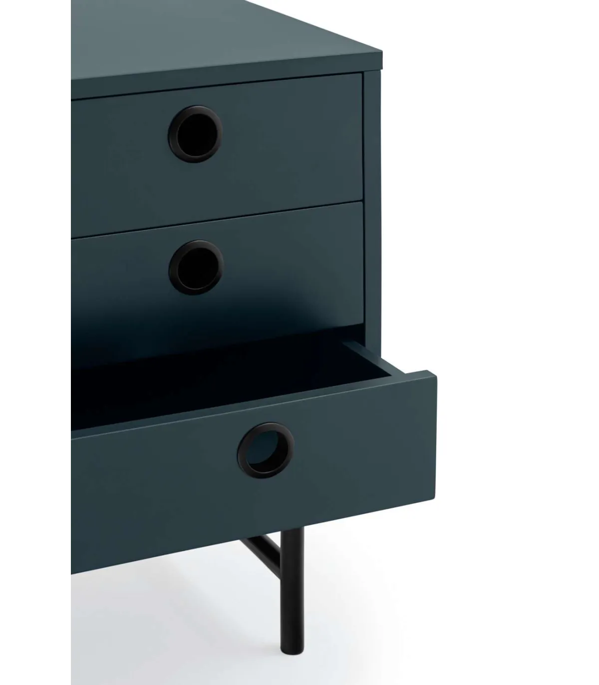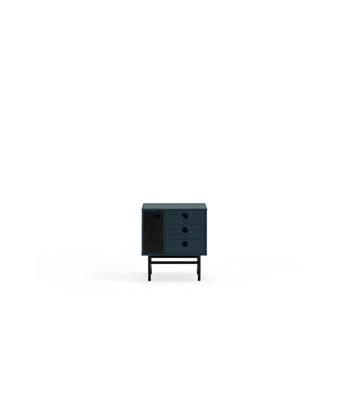 Mesa noturna para modelo de quarto Porta 1,3 gavetas, com inspiração industrial clara, integra elementos deste estilo com linhas limpas e sofisticadas. A porta de metal perfurada é o aspecto mais característico e distintivo de Punto, sendo completamente integrado no design e acabamento desta coleção. Fabricado com placa MDF lacada. Pés metálicos. Disponível em preto/azul/antracite.