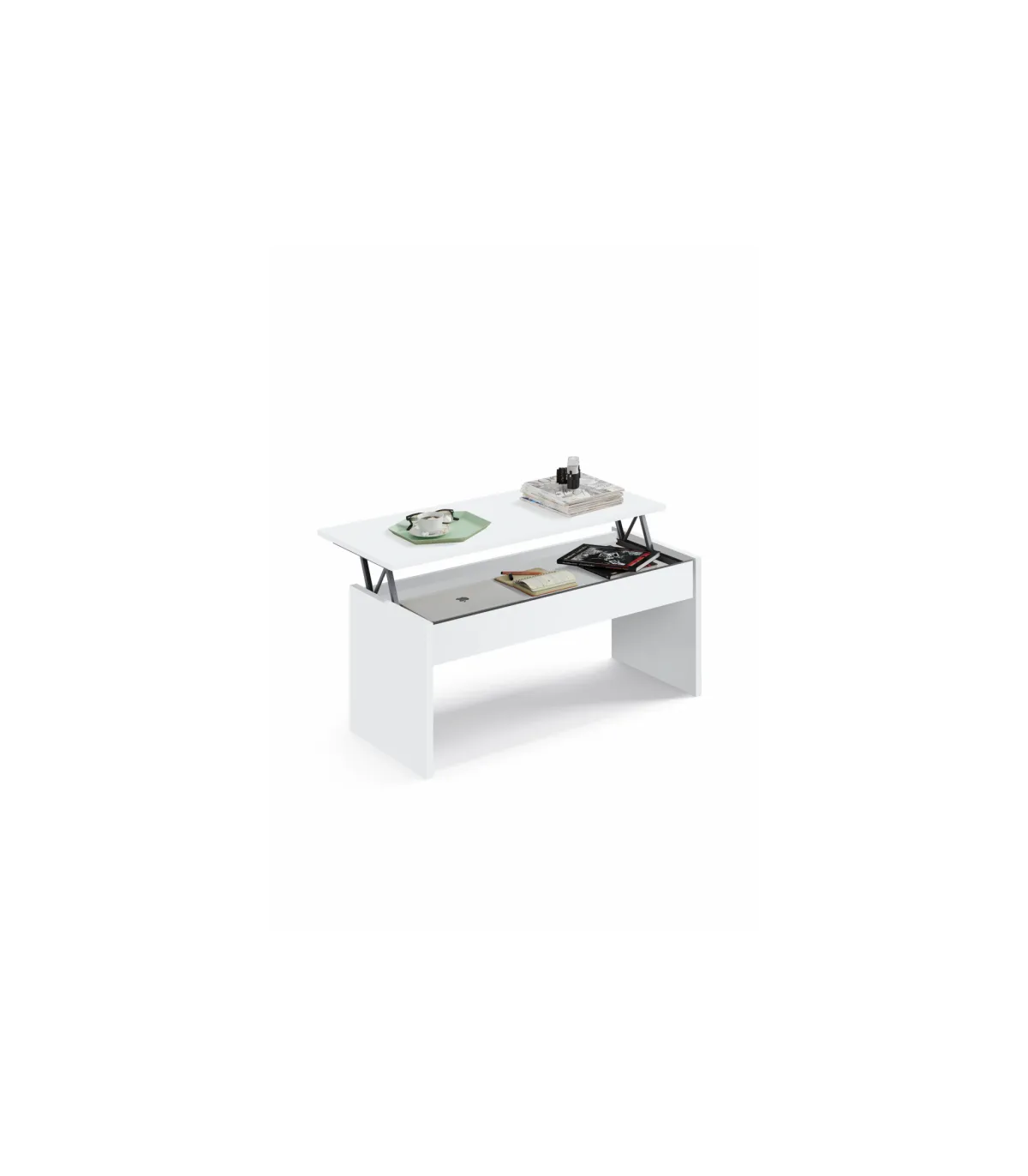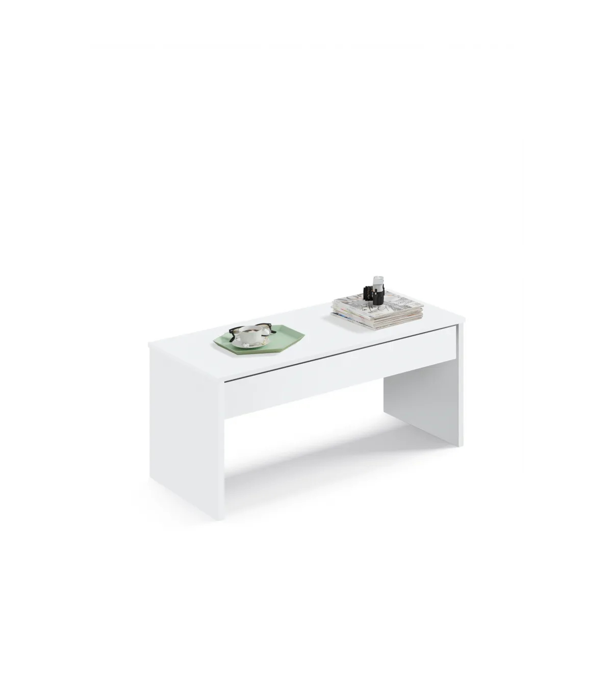 Mesa elevável com compartimento branco, tampa com acabamentos em imitação em Marmol Preto.