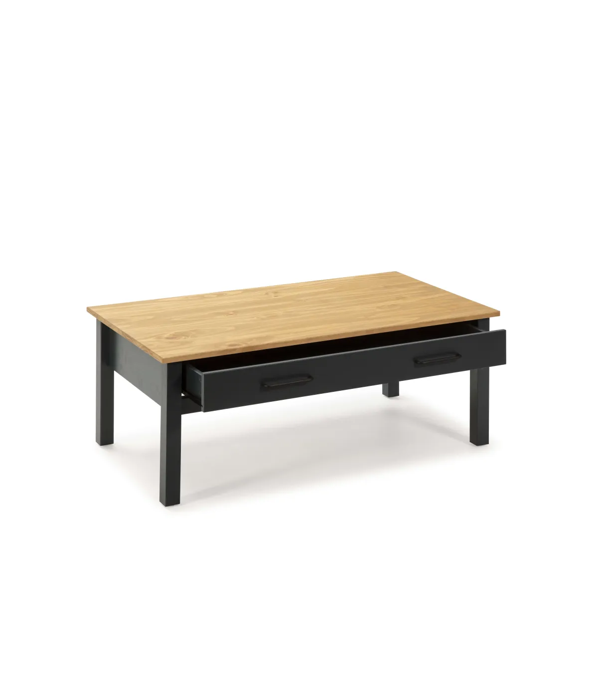 Uma característica proeminente da mesa central é sua gaveta frontal, que fornece espaço para armazenar pequenos objetos e manter a área ordenada. As tiras de metal preto com guias de metal não são apenas funcionais, mas também adicionam um toque de modernidade e contraste ao design.