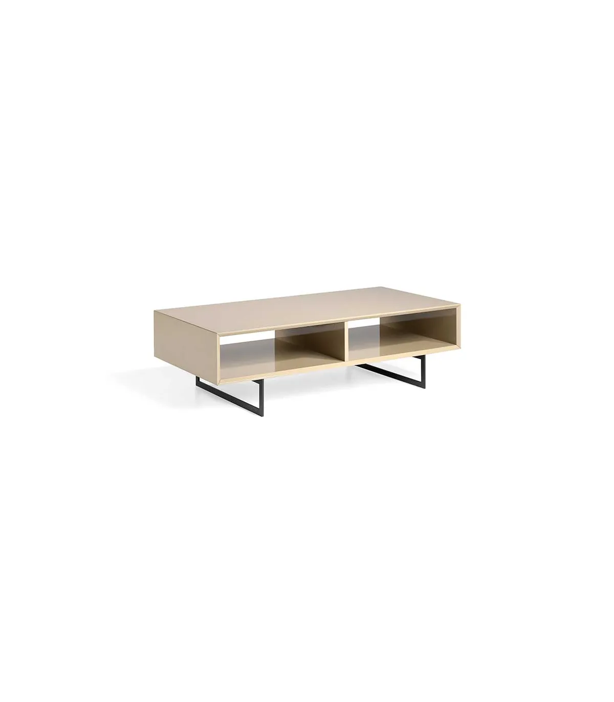 Mesa central em formato retangular com dois compartimentos abertos em madeira MDF lacado em alto brilho tom moka. Suas pernas são metal pintado em preto mate.