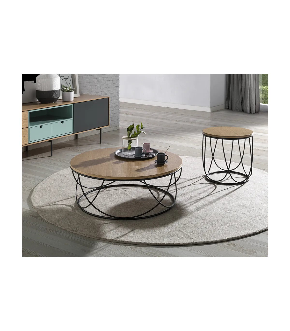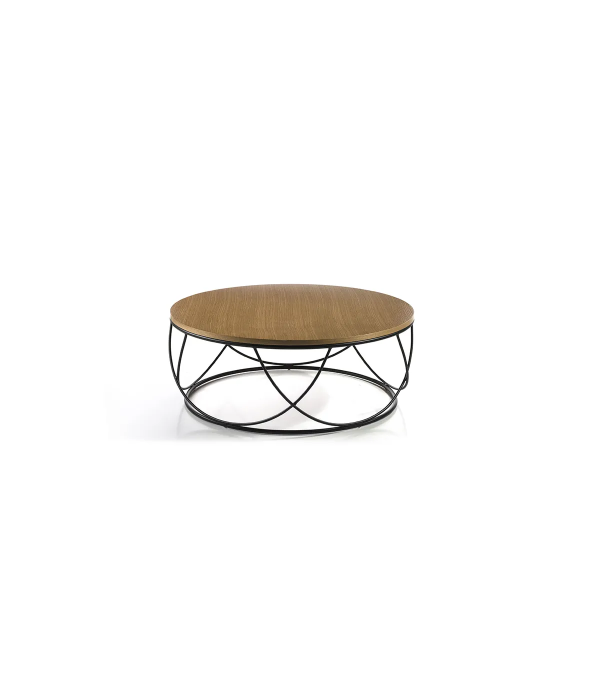 Mesa em forma circular com topo de folha de carvalho. Estrutura tubular cruzada pintada em preto fosco.