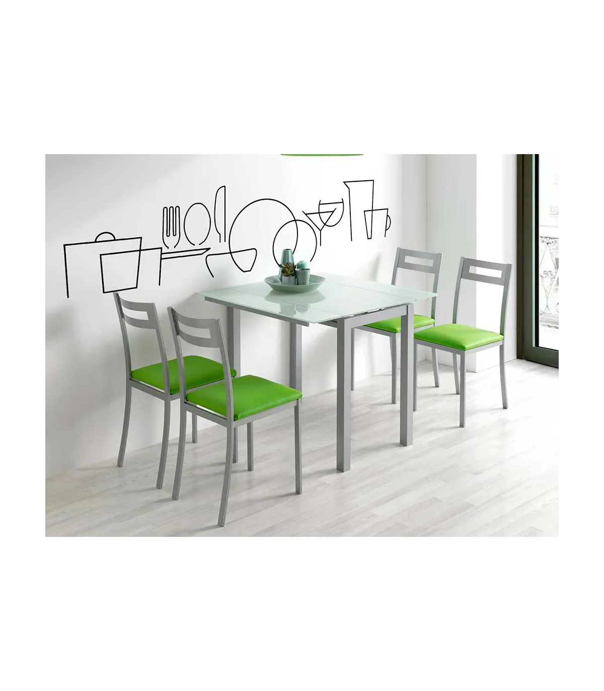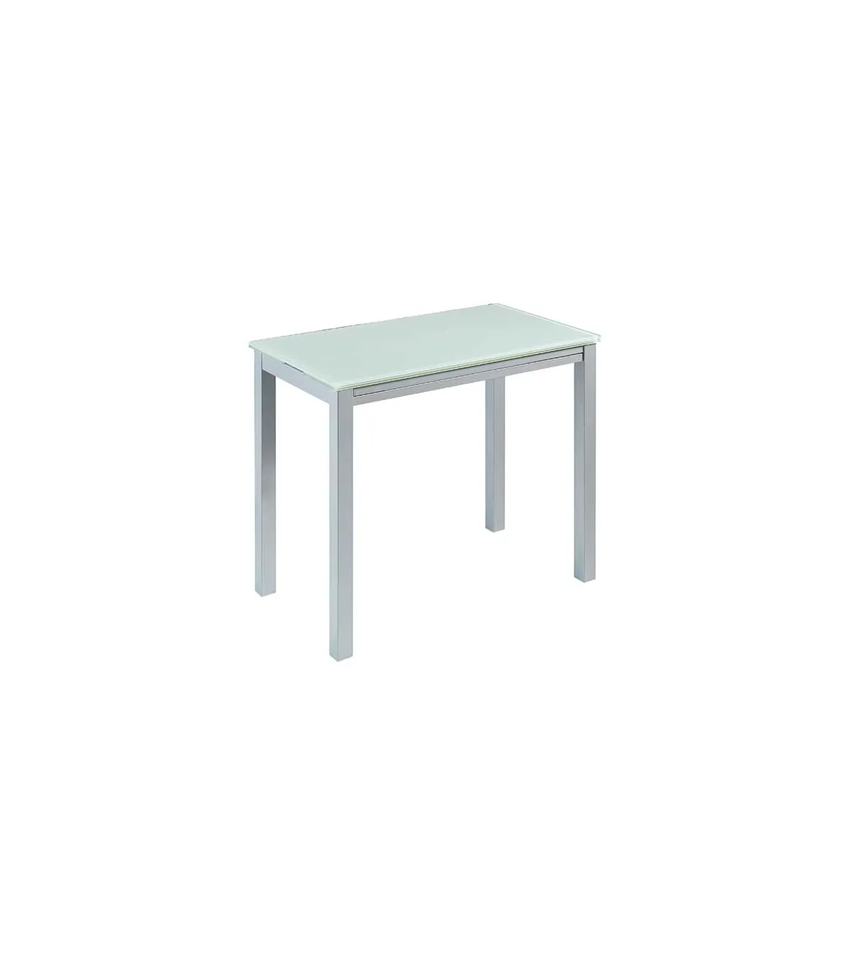Mesa extensível com estrutura metálica com acabamento em níquel mate e bancada de trabalho e asas de vidro temperado branco. Excelente mesa para ambas as cozinhas e salas de jantar com asas extensíveis na parte larga que ao abri-los dá à mesa de medidas ideais para comer em família.