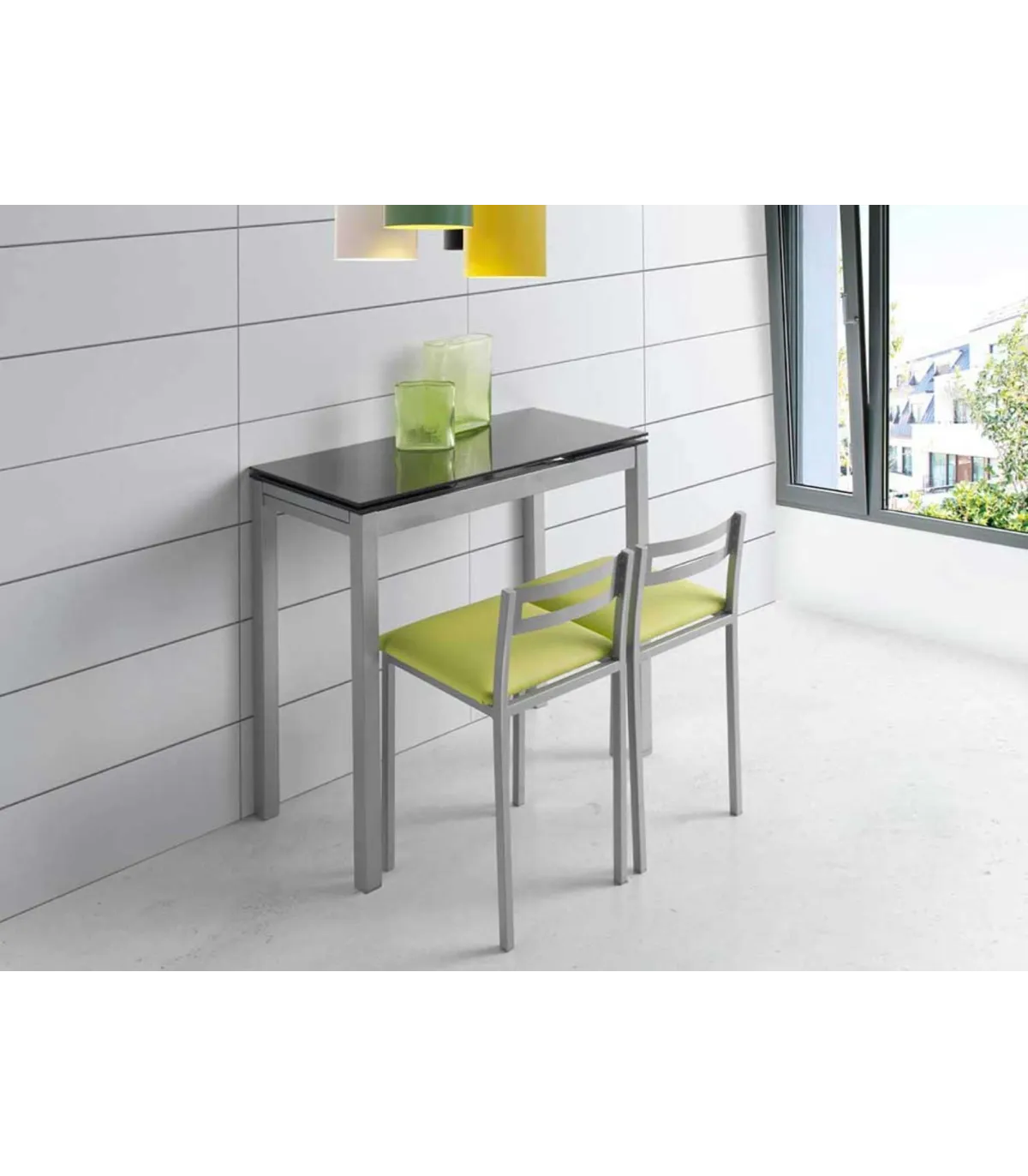 Mesa de cozinha extensa. Sua estrutura é metálica com um acabamento mate níquel e asas de vidro temperado preto.
