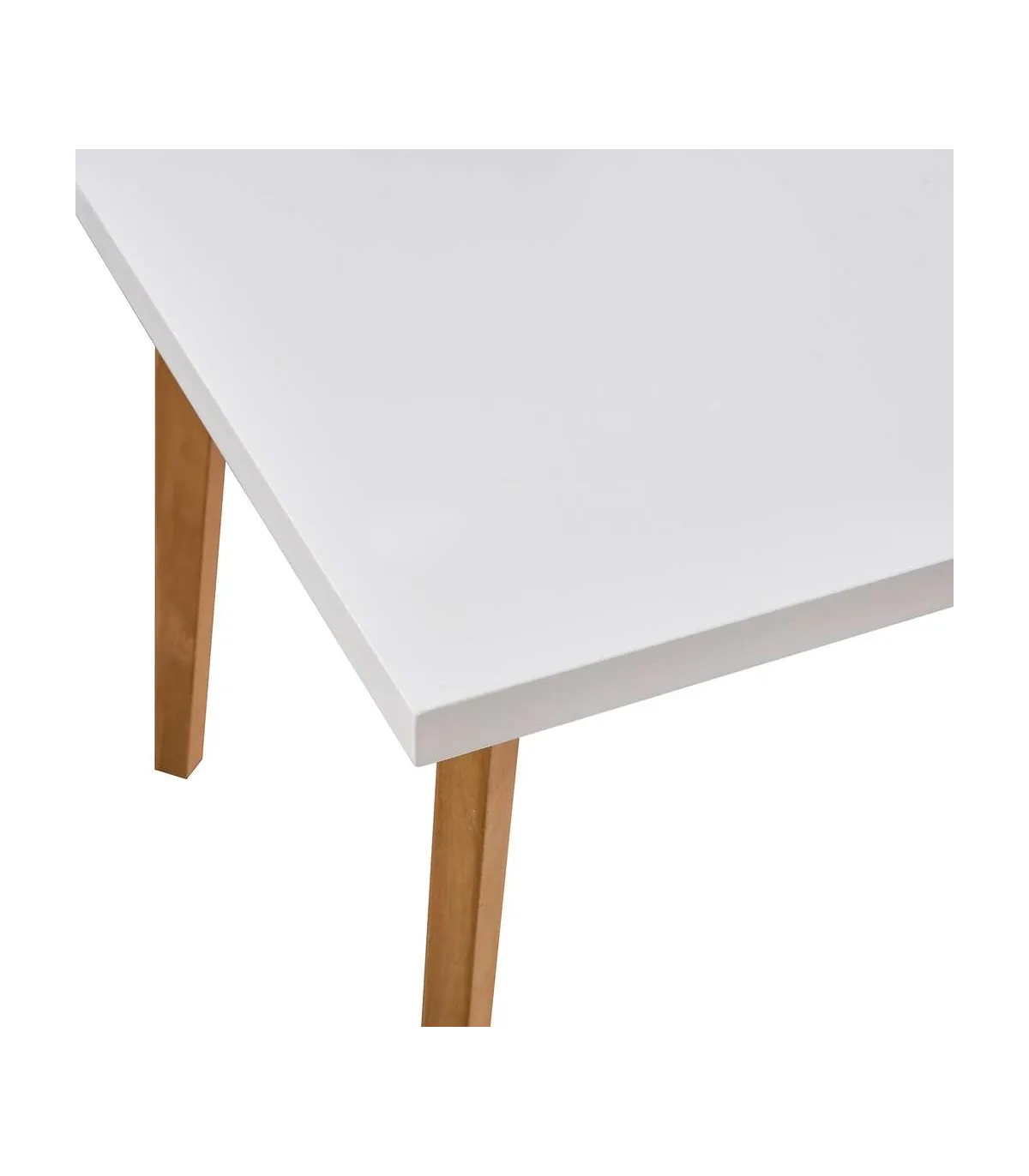 ▪ O topo da mesa é feito de MDF (fibra de densidade média) lacado em branco, que fornece um acabamento suave e brilhante. A superfície lacada é fácil de limpar e manter, tornando-a ideal para uso diário em casa.