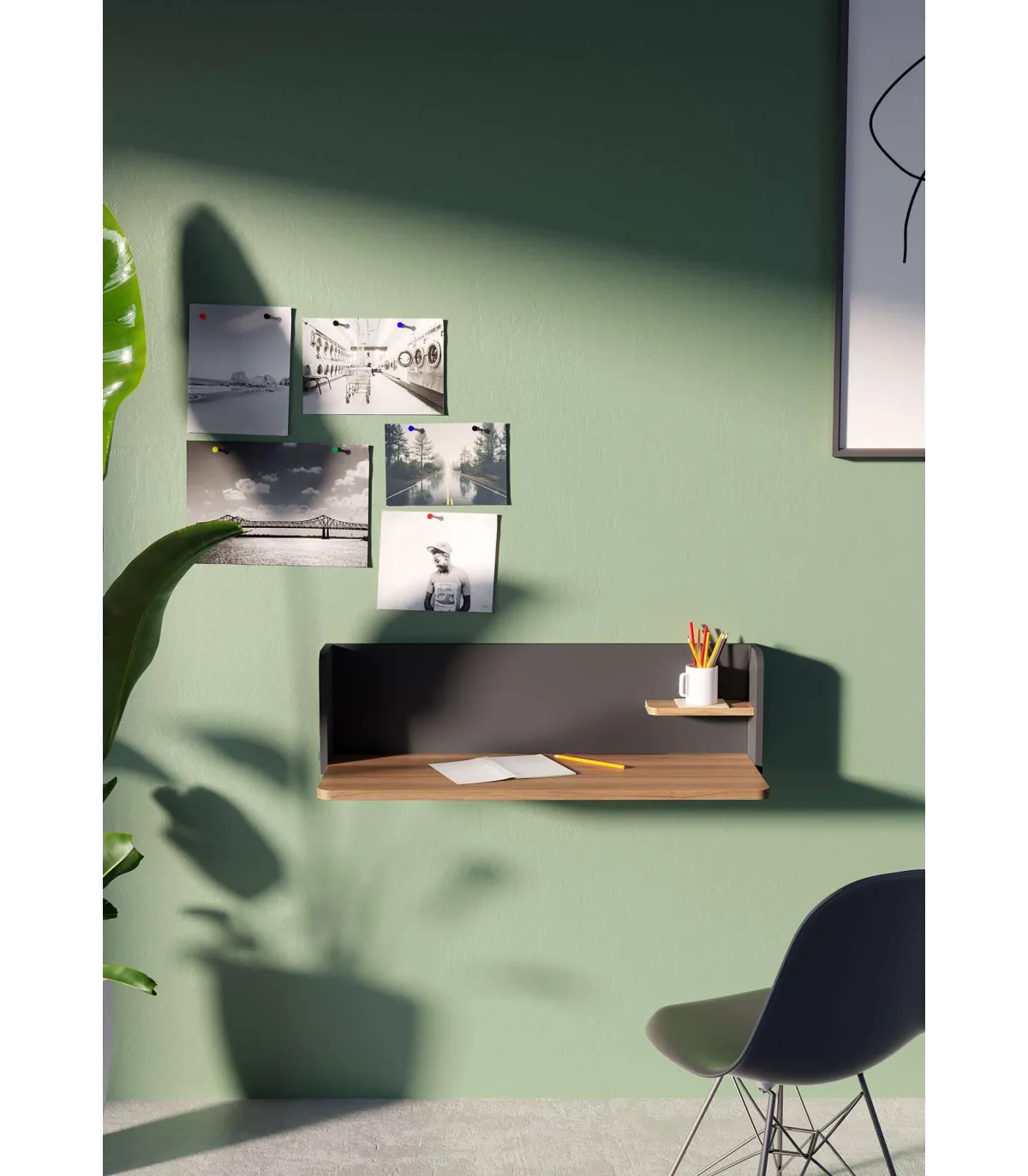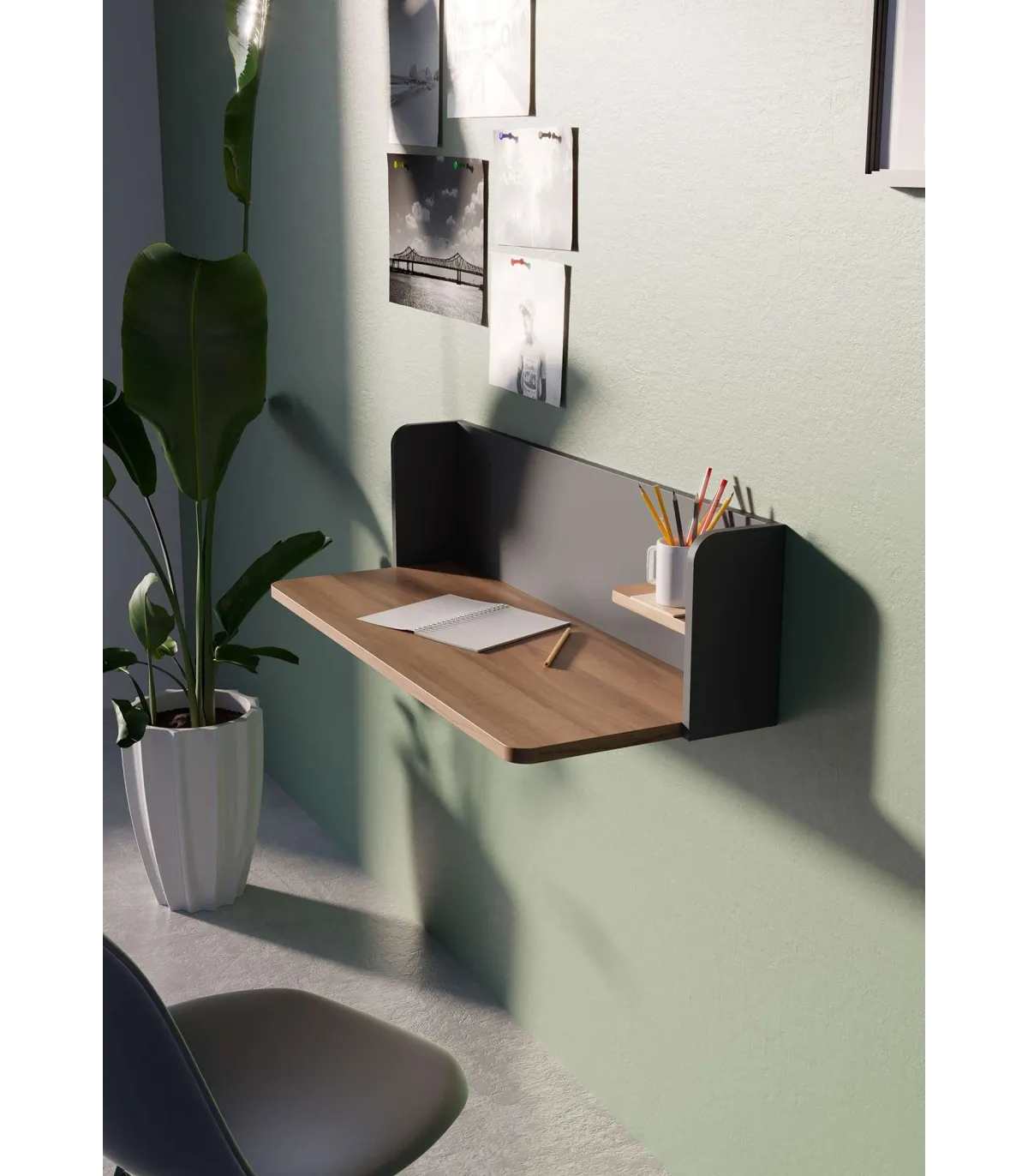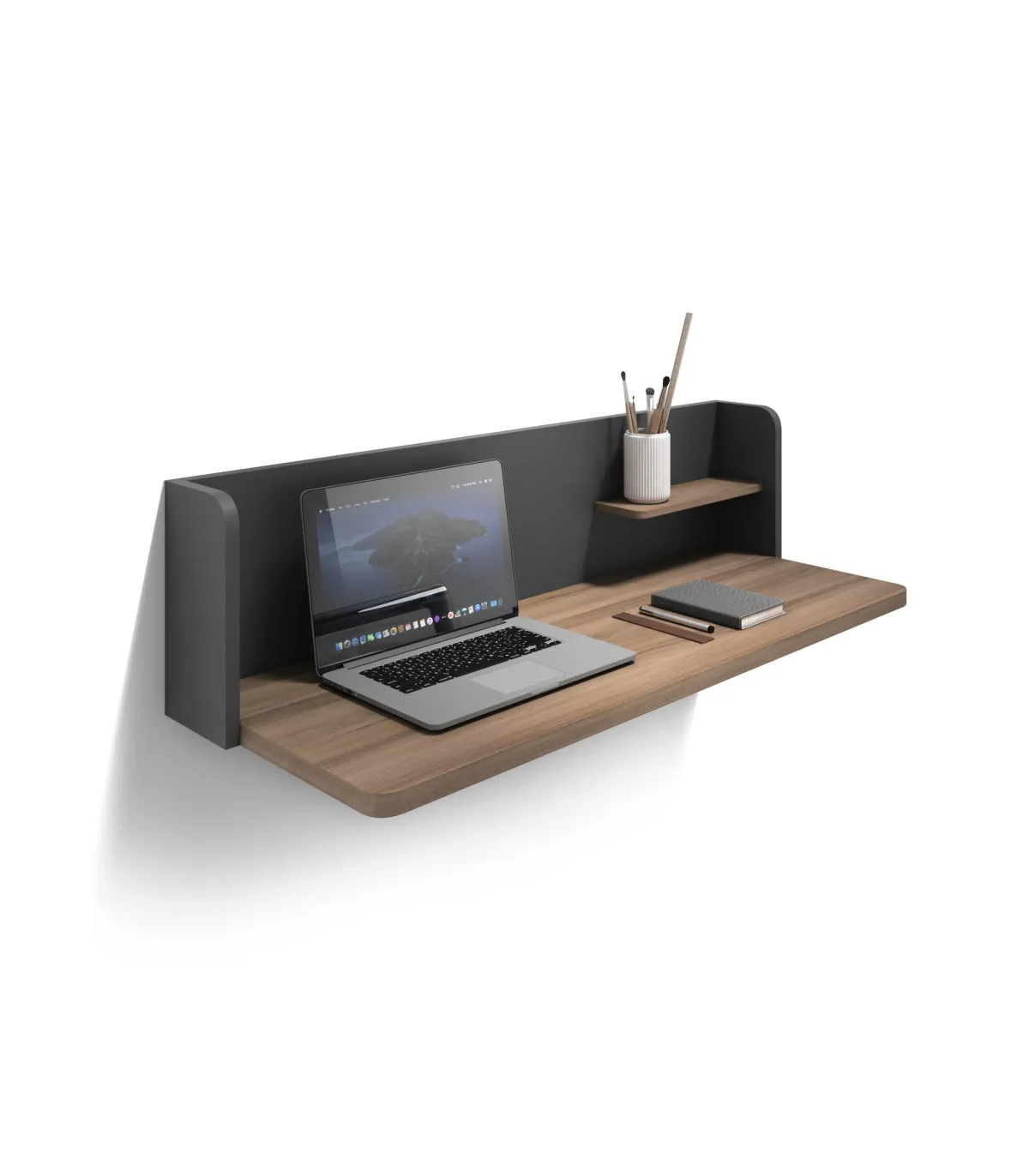 Wall desk suspenso do estilo moderno e atual, ideal para qualquer estadia em sua casa. Fabricado em folhas de duas lâminas, pintadas em PVC e com cantos arredondados de cor de noz combinada com grafite.