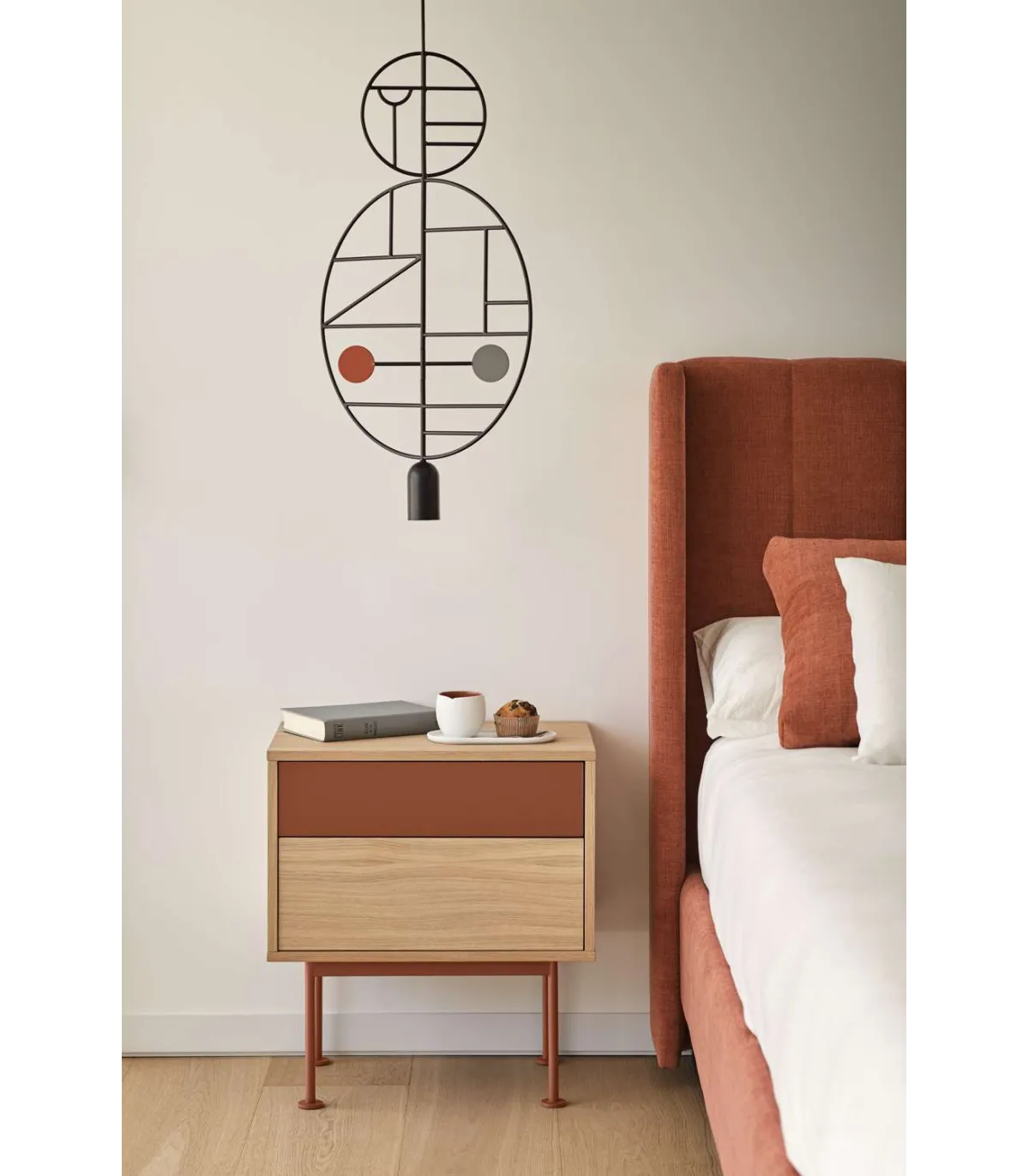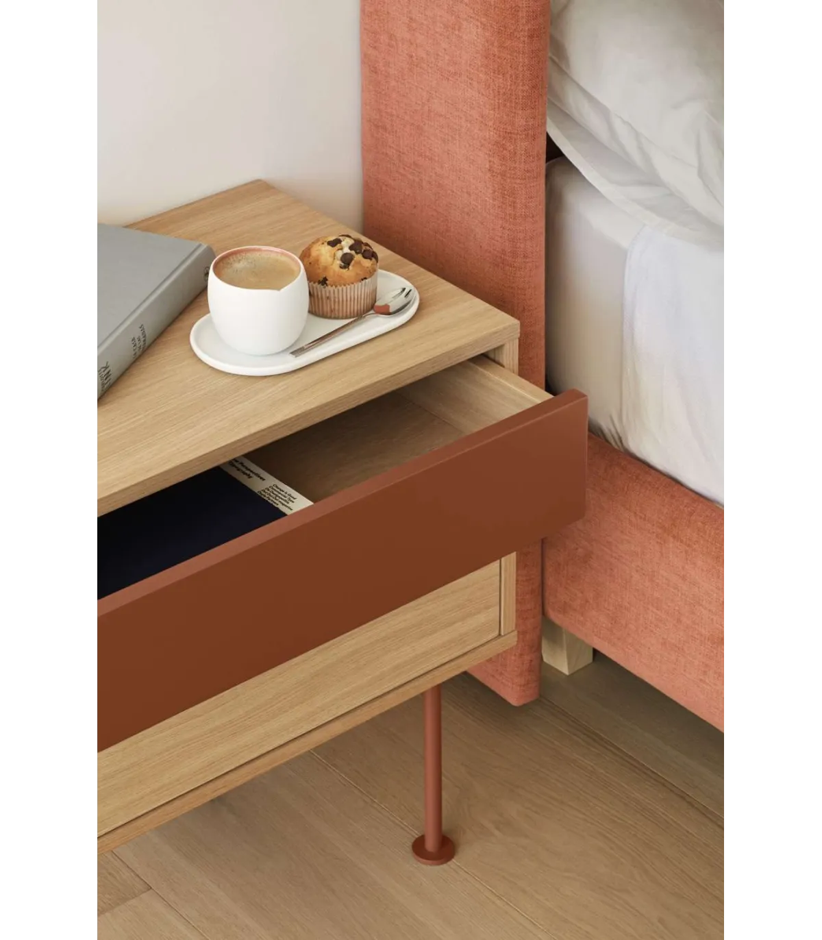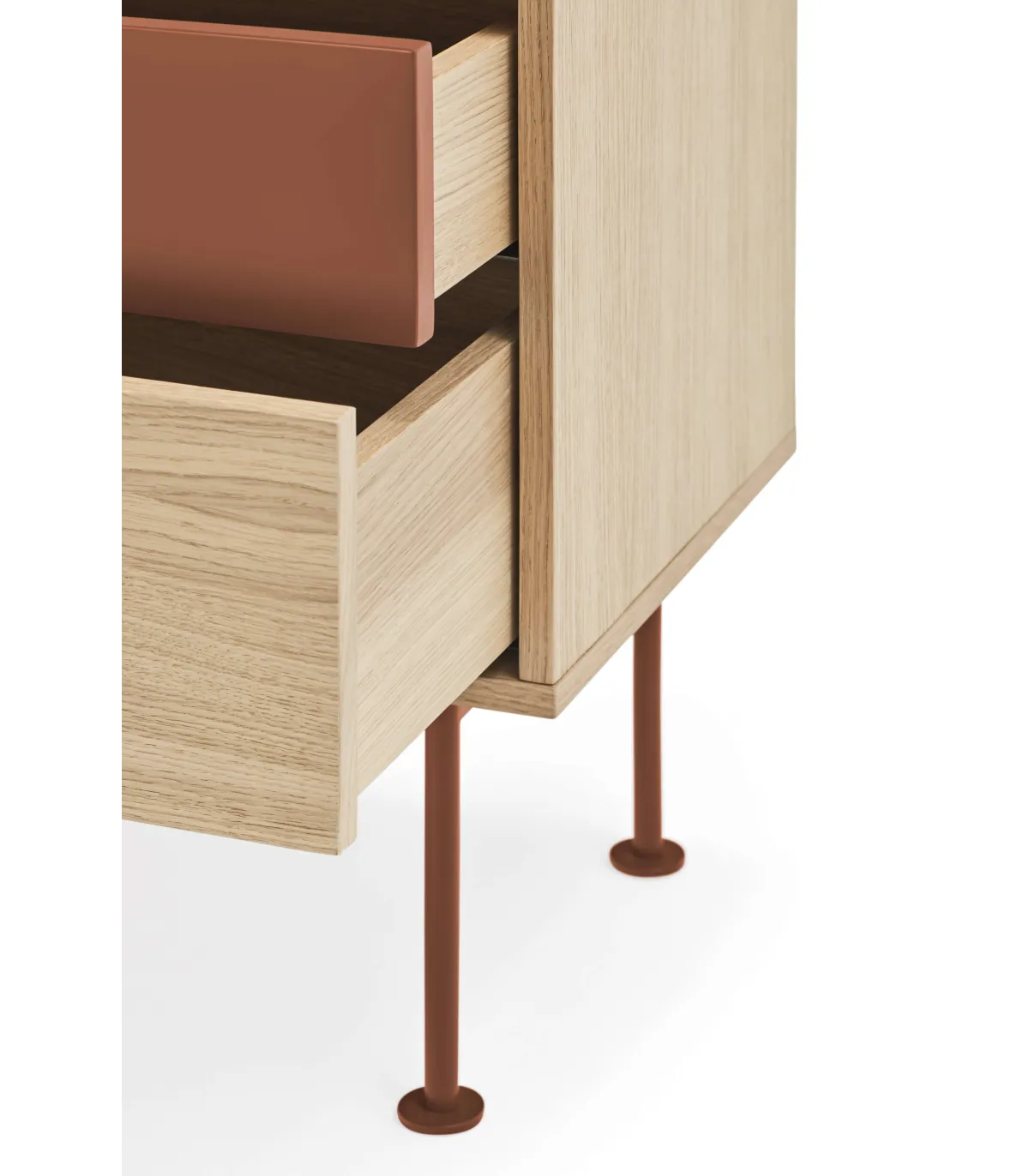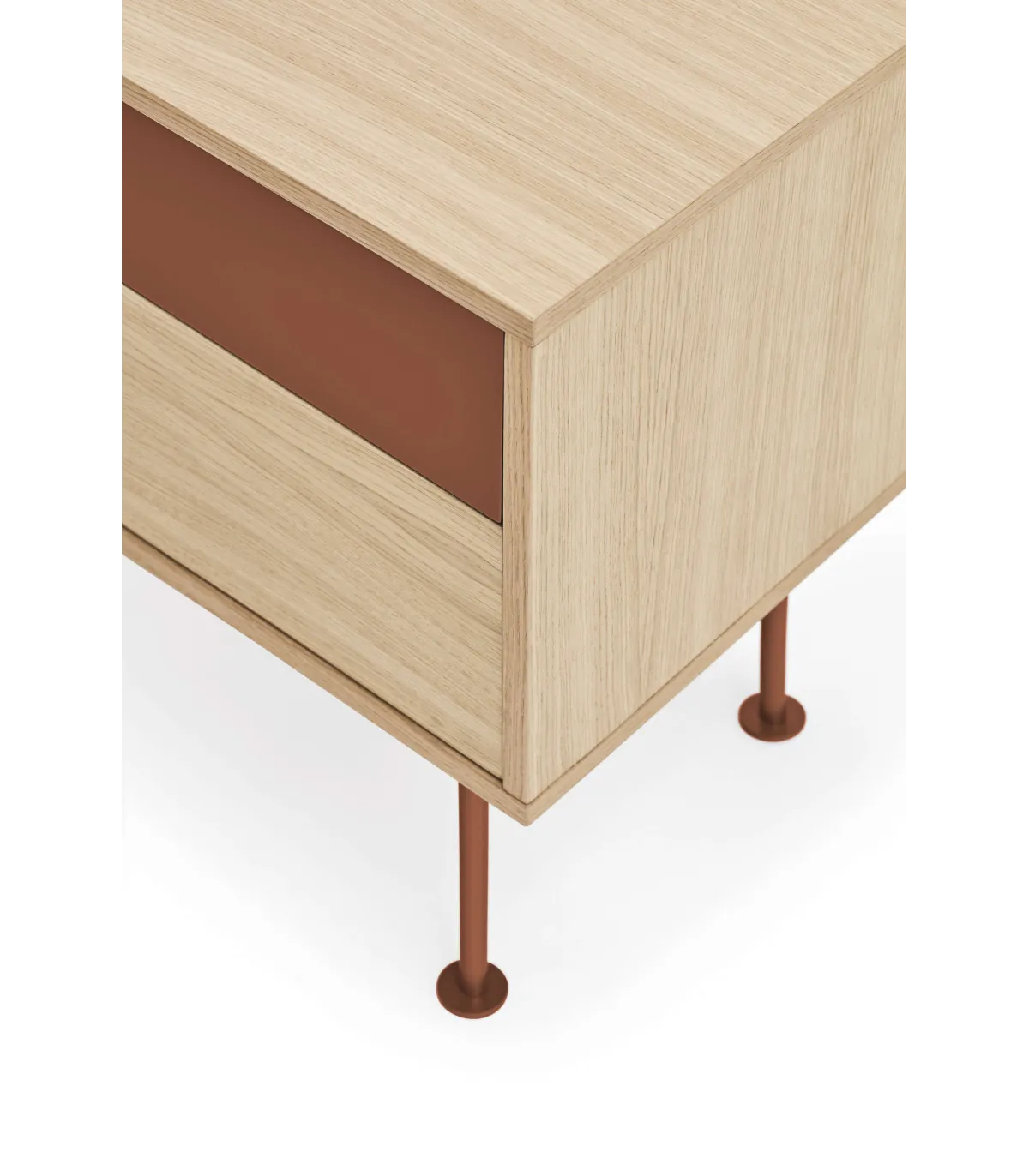 Mesita noite para modelo de quarto Yoko 2 gavetas, chapeado em madeira de carvalho disponível em cor vermelha/vermelho.