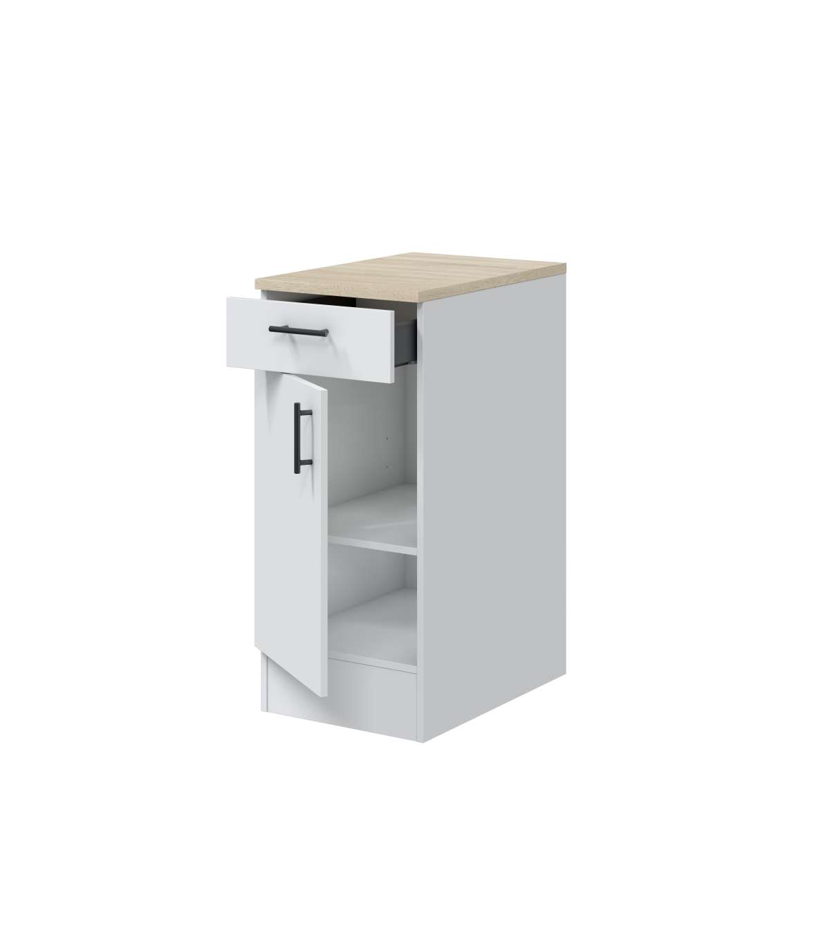 Mobília de baixa cozinha com uma porta. Feita de melamina de alta qualidade, frontal combinam brilho em branco com 15 mm de estrutura de batalha fosco e soquete, proporcionando um estilo moderno e brilhante para a sua cozinha. Inclui bancada no acabamento canadense de carvalho de 22 mm, que fornece calor e contraste natural.