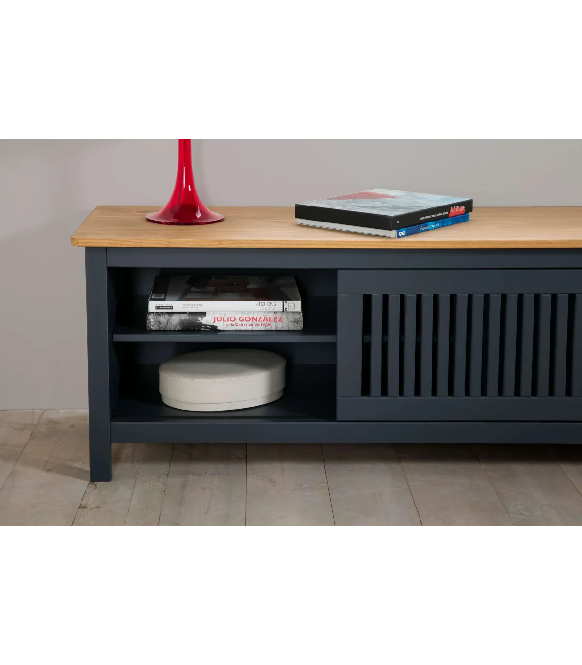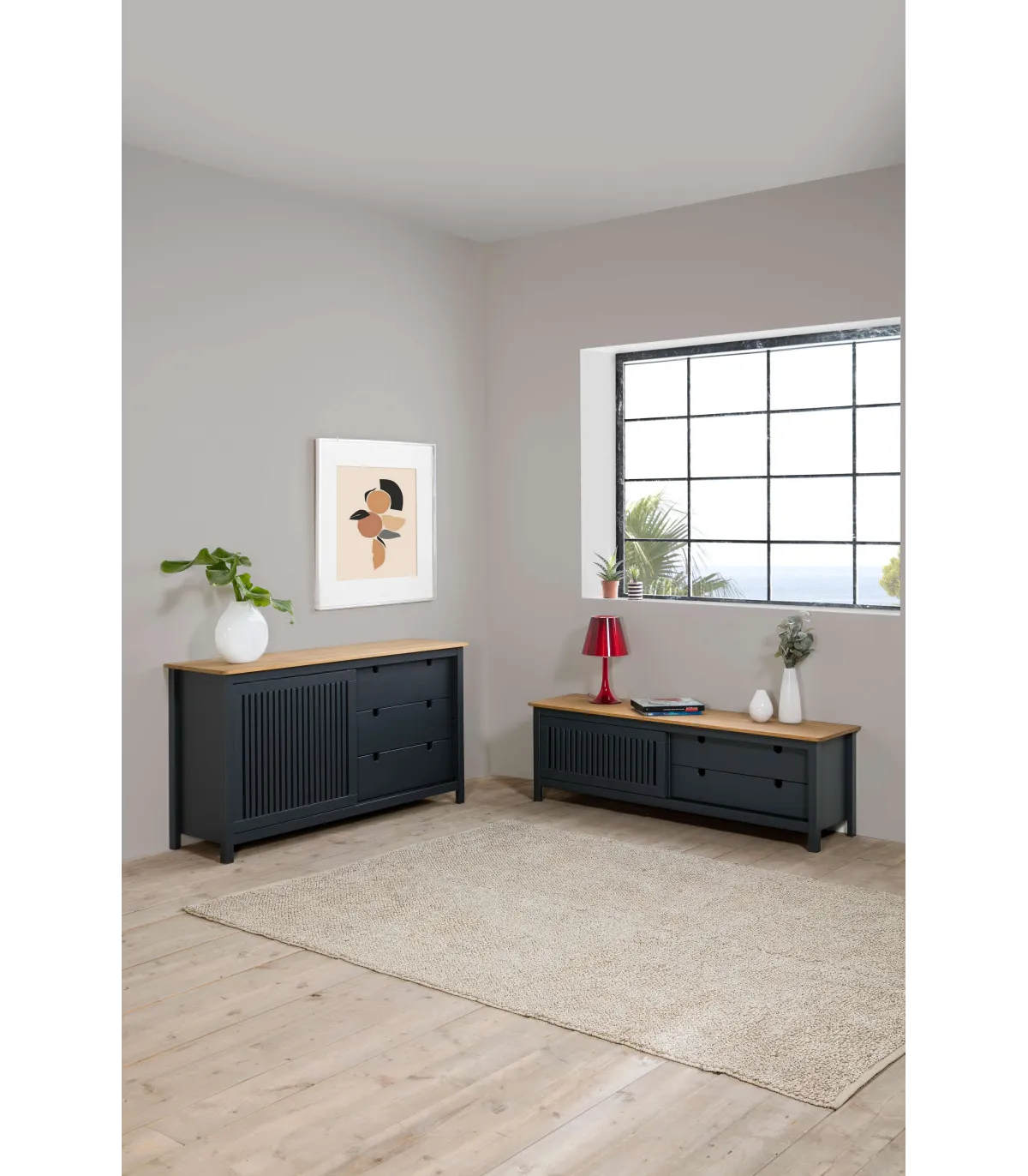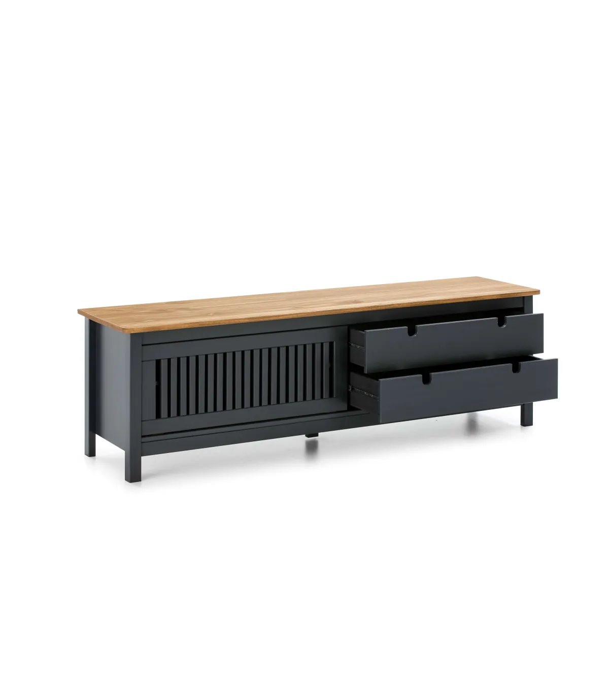 O mobiliário de TV Luna possui duas gavetas com guias de metal, garantindo um slide suave e acesso confortável aos seus objetos. A porta deslizante é um detalhe moderno que adiciona um toque de elegância e praticidade ao design. Além disso, a porta deslizante tem uma prateleira interior que oferece espaço para organizar seus dispositivos eletrônicos ou outros objetos.