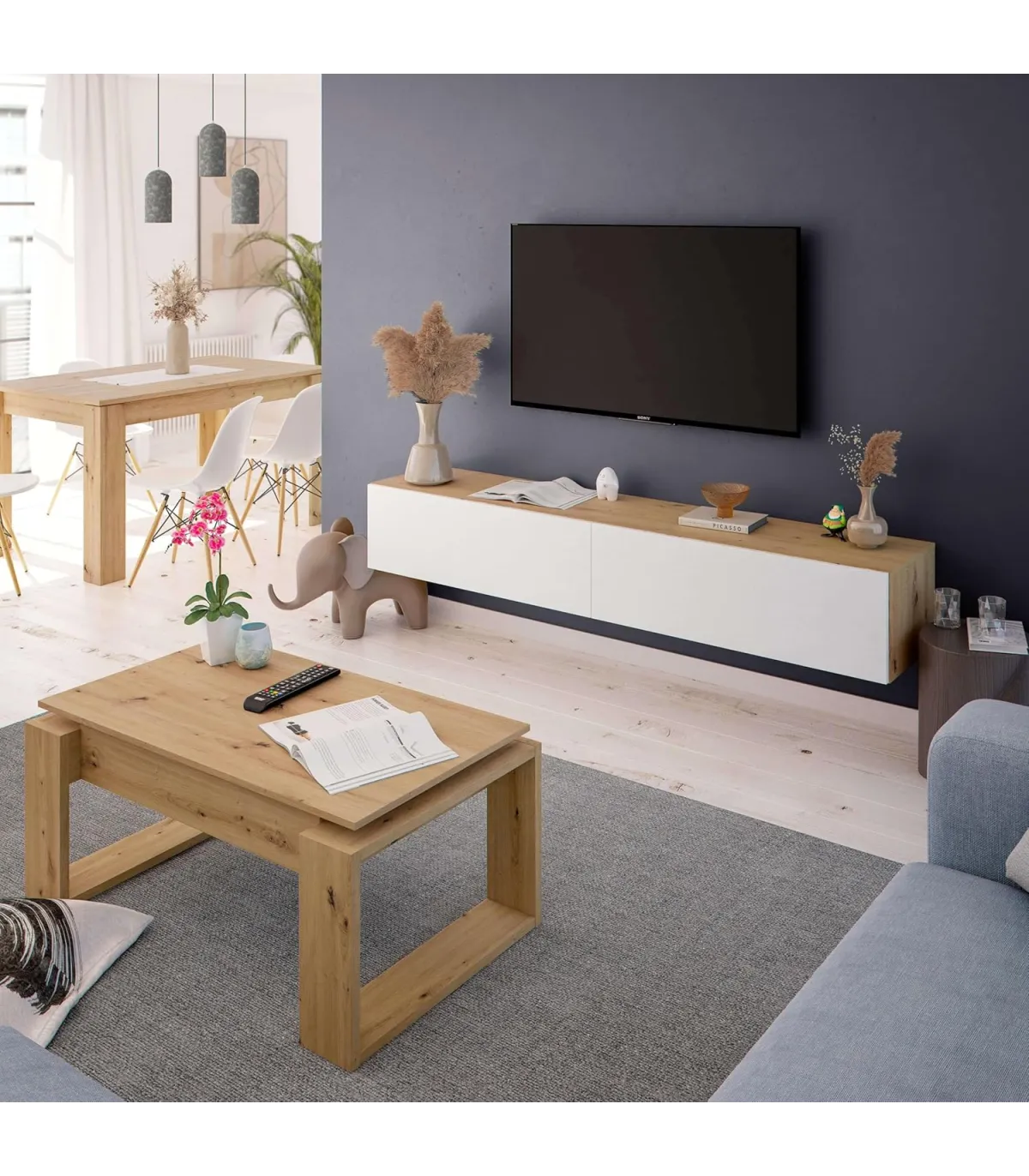 Transforme seu quarto com a elegante mobília TV Marisa em carvalho canadense e Artik branco · Design moderno · Espaço otimizado.