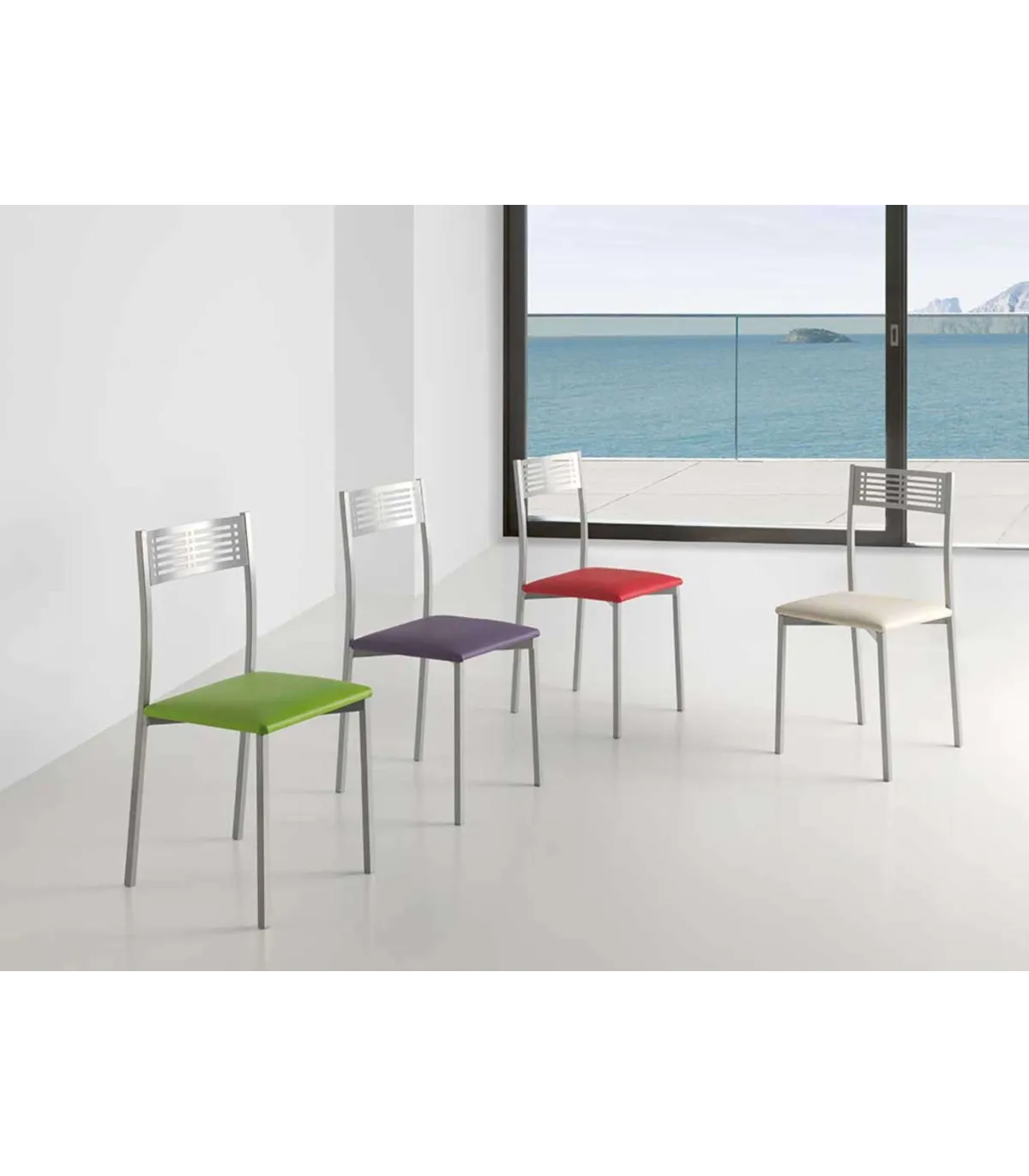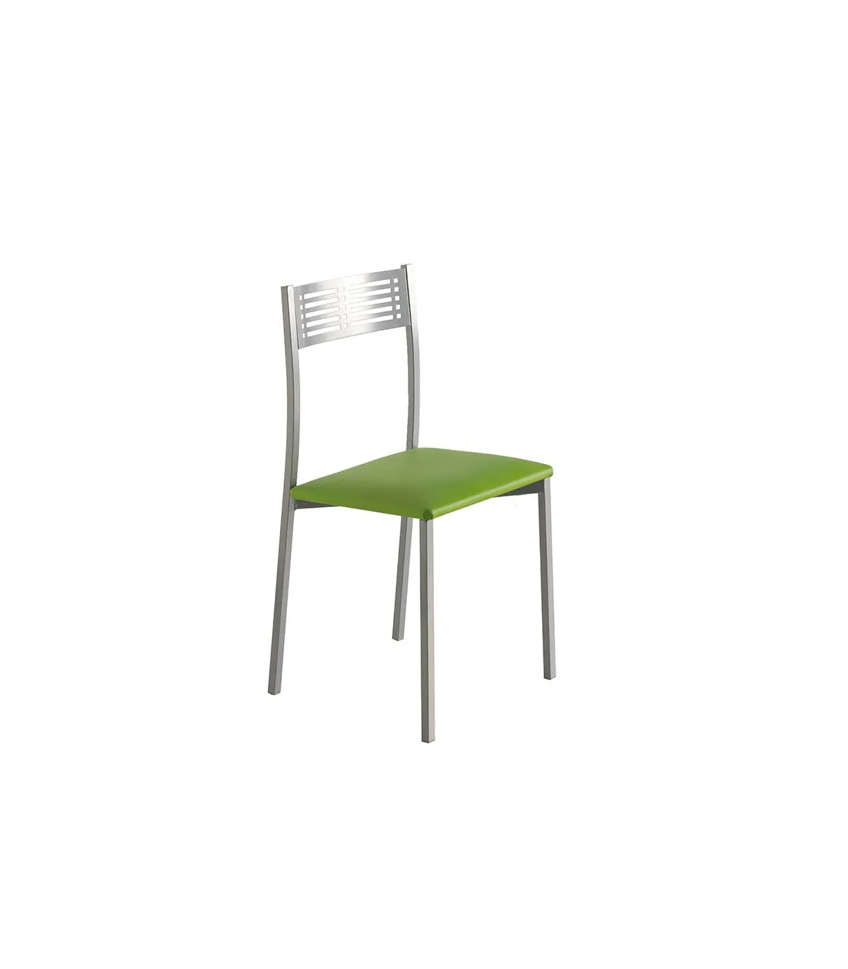 Pacote de 4 cadeiras de design com estrutura metálica com acabamento níquel mate, e assento almofadado em polipiel verde de alta qualidade, têm um efeito suave.