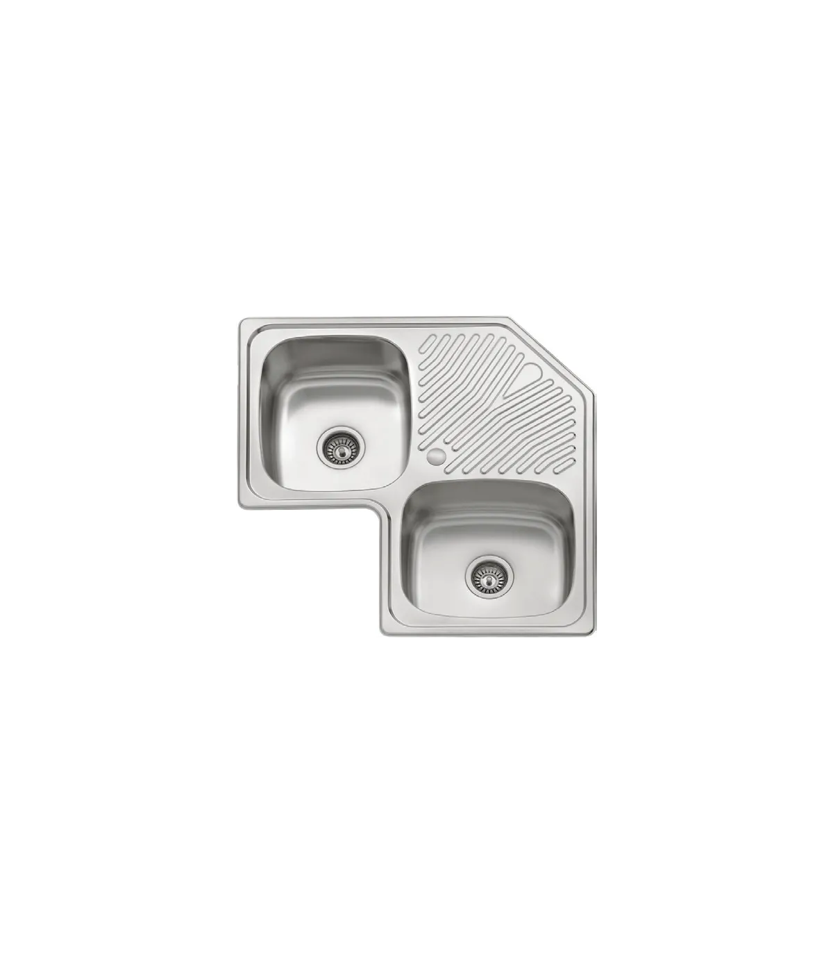 Fabulosa pia no canto de 2 peitos de aço inoxidável, é perfeito se você tem pouco espaço e não quer desistir de ter 2 seios e também superfície de secagem.