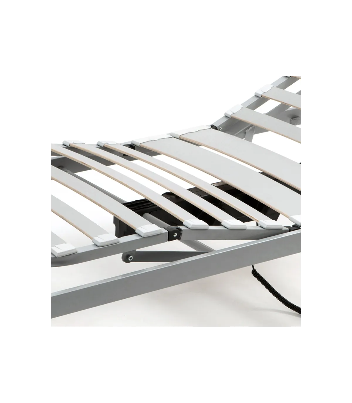 Os planos motorizados Somier 5 apresentam uma estrutura de estrutura dupla sólida e 5 planos de articulação que são regulados por um motor com controle remoto sem fio. Tem lamas flexíveis de 38 mm feitas com madeira compensada, faia natural, com o rosto exterior esmagado em melamina cinza. Agrupado em série de duas lamas por unidade de suporte e reforçado na parte lombar para aumentar a firmeza. Esta firmeza é graduada através de tensões regulatórias.