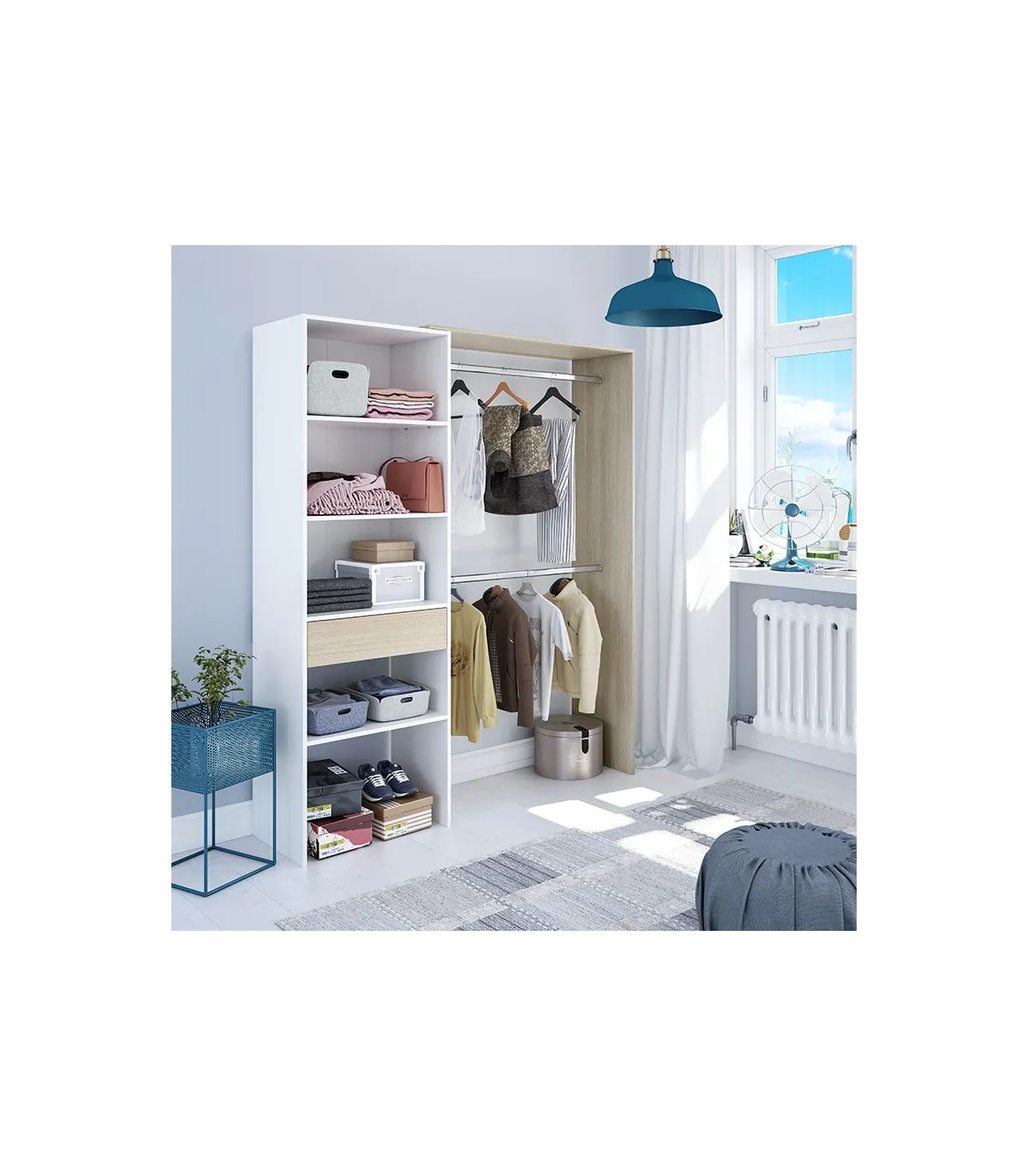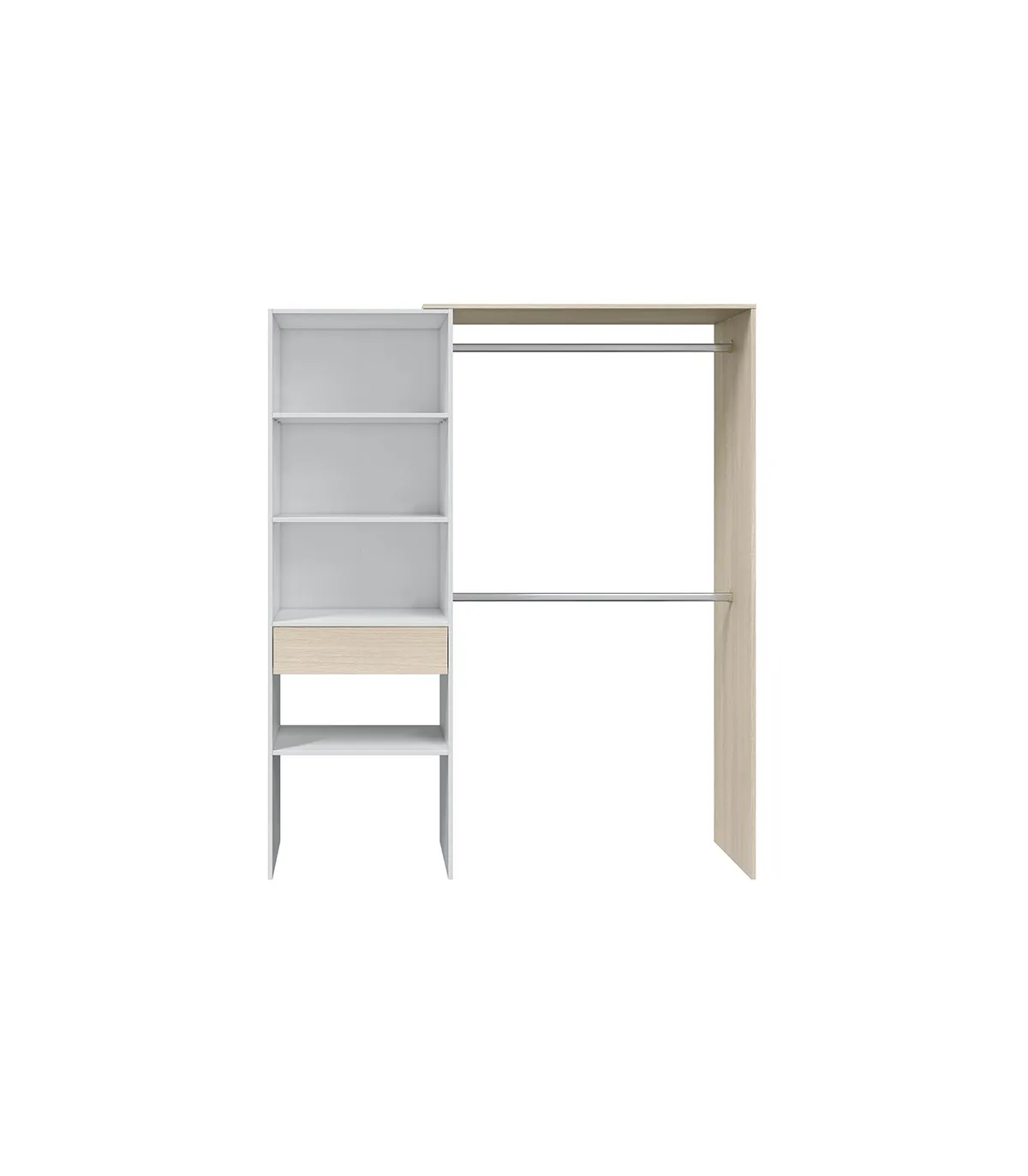 Vestir guarda-roupa Elfos em branco e carvalho com prateleiras, uma gaveta e 2 barras penduradas.