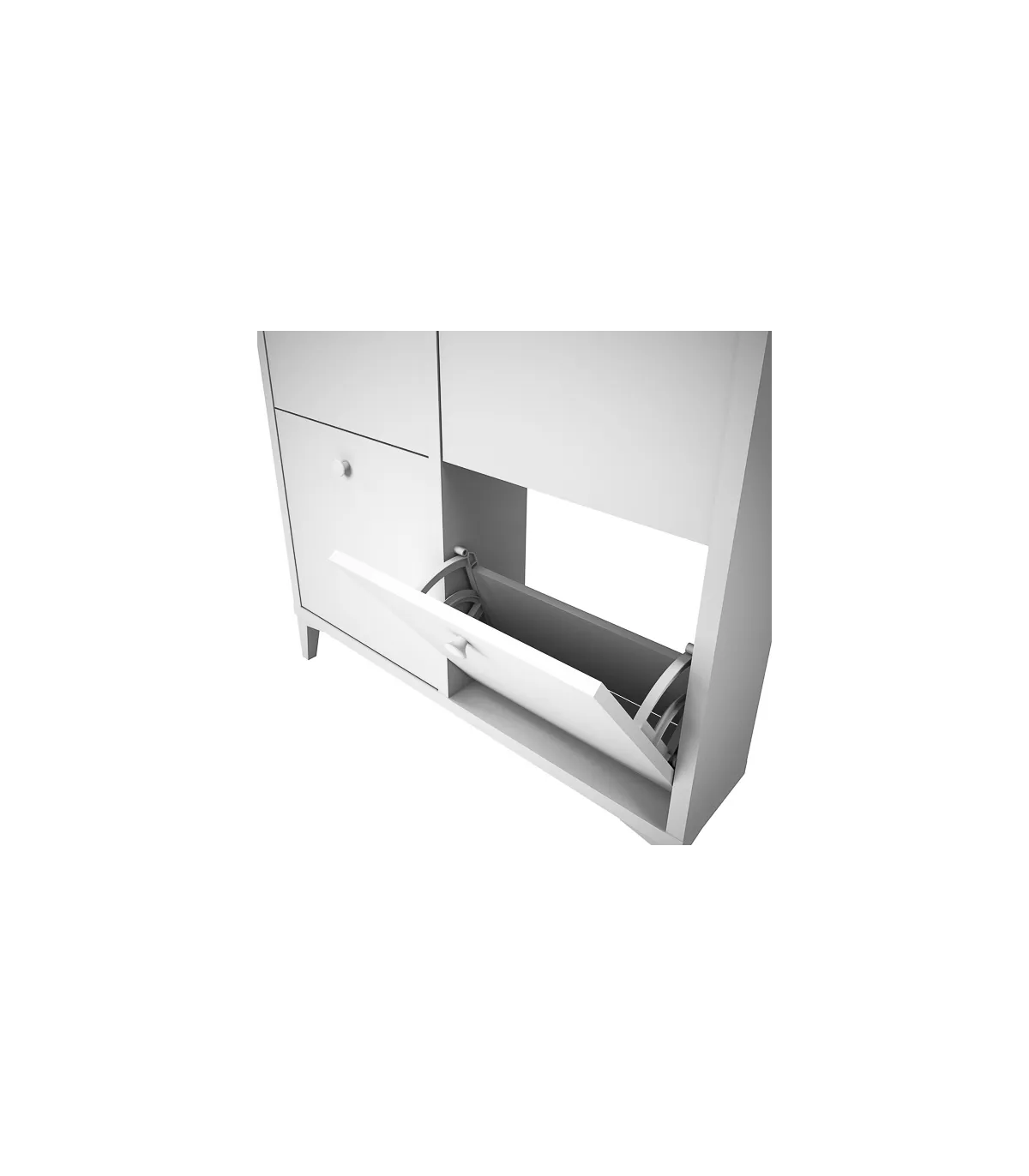 É composto por quatro trampões, tem capacidade para aproximadamente 8 pares de sapatos e está disponível em branco macio ou branco macio / nó de carvalho.